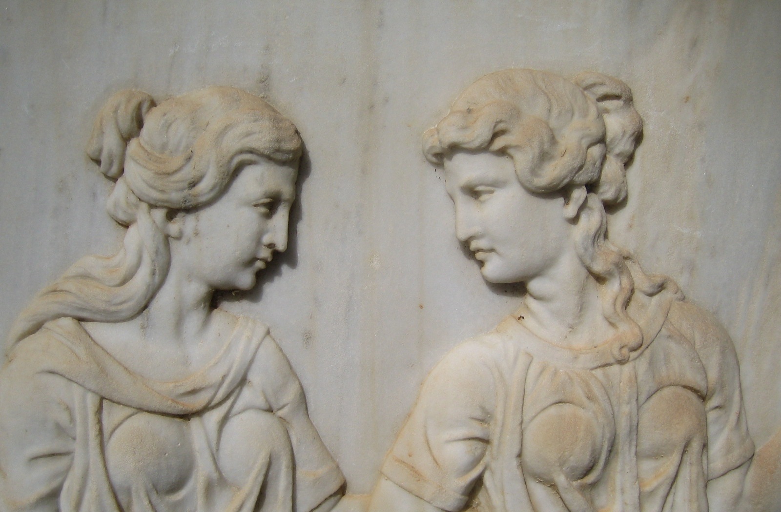 Η πλάκα αυτή, μετά την εκταφή των κοριτσιών, έγινε (προφανώς λόγω της υψηλής τέχνης κι αισθητικής της) στόχος επαναχρησιμοποίησής της σε άλλον τάφο. Για τούτο, κάποιοι άφρονες ασεβείς, απολάξευσαν βάναυσα από την μαρμάρινη πλάκα τα ονόματα και τις ημερομηνίες.