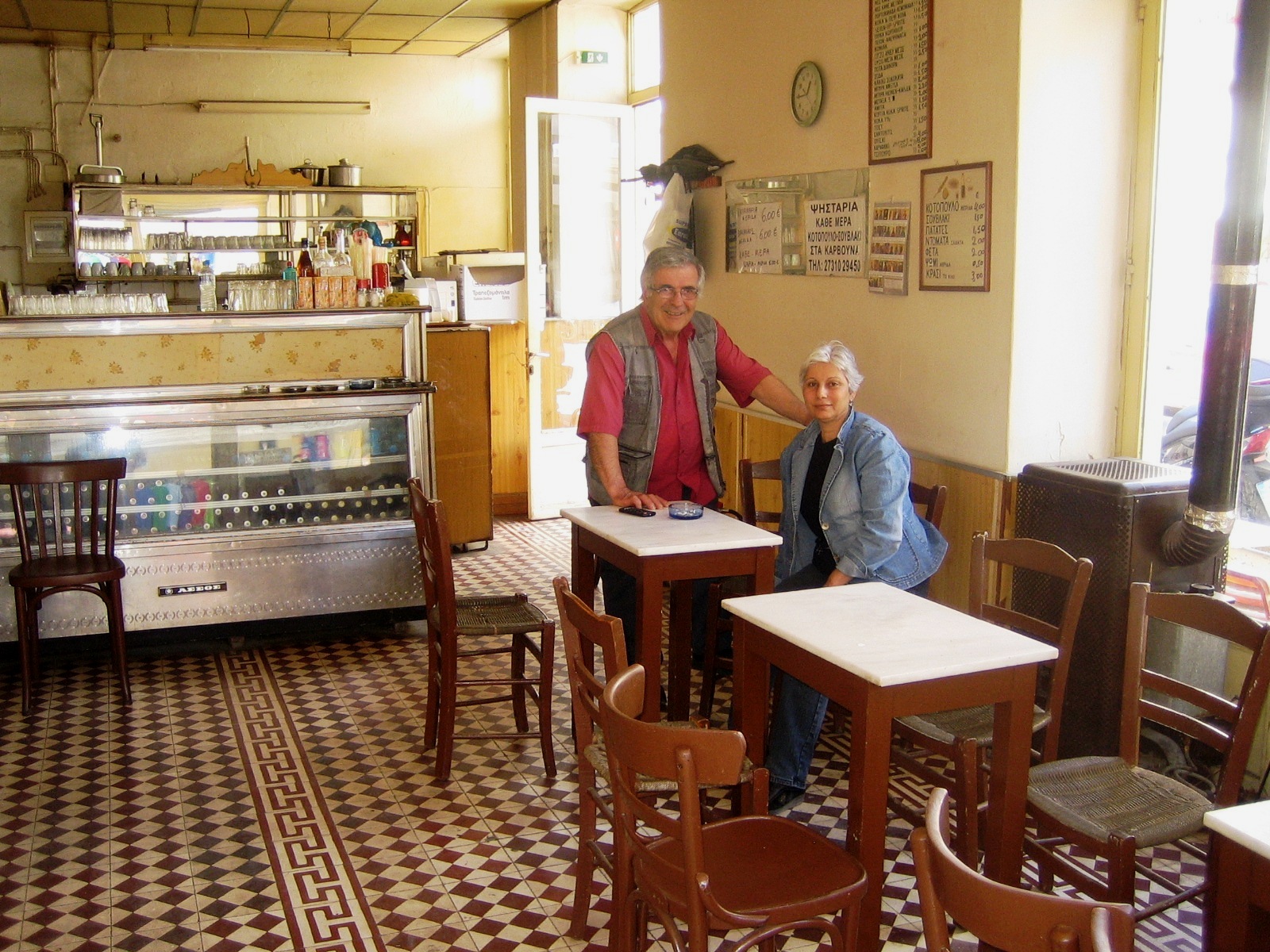 Ο Κώστας με τη γυναίκα του τη Σοφία Γεωργίου Θεοδοσίου από τη Σπάρτη με ρίζες από Μ. Ασία που ανέλαβαν την ευθύνη να ταξιδέψουν το μαγαζί στις επόμενες δεκαετίες, είχαν τη σοφία και την προνοητικότητα να μην αλλάξουν την ταυτότητα, το χαρακτήρα, την ατμόσφαιρα που ιστορικά κουβάλαγε μαζί του το καφενείο και την όλη εικόνα του: Τα παλιά κεραμικά πλακάκια με τους καφετιούς ρόμβους και τους μαίανδρους παρέμειναν στο πάτωμα. Τα παραδοσιακά τραπεζάκια με το μάρμαρο που περηφανεύονται ότι κουβαλούν επάξια την ιστορία και την παράδοση του καφενείου καθώς και οι ξύλινες καρέκλες «τύπου Βιέννης» με ιστορία και αναμνήσεις ετών παρέμειναν επίσης στη θέση τους, όπως και το παλιό επαγγελματικό ψυγείο μάρκας «ΑΣΣΟΣ», που, επιβλητικό και σοβαρό δεσπόζει ακόμα στο χώρο κάνοντας άψογα τη δουλειά του, αν κι έχουν περάσει από πάνω του τόσα χρόνια. Πίσω από το ψυγείο η κουζίνα με το πετρογκάζ, τα μπρίκια, τα κατσαρολικά, τα τηγάνια, τα ποτήρια, τα φλιτζάνια, τους δίσκους και όλα τα συναφή καθώς και η μεγάλη ψησταριά για τα ψητά της ώρας. Ένα μοναδικό σκηνικό βγαλμένο από ανέκδοτες ιστορίες των παππούδων σου. Μερικοί καθρέφτες, ένα ρολόι, μια τηλεόραση και ο απαραίτητος κατάλογος στον τοίχο συμπληρώνουν τη λιτή και απέριττη διακόσμηση αυτού του παραδοσιακού και αυθεντικού καφενείου της Σπάρτης.