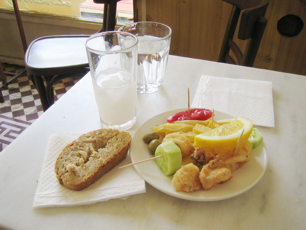 Ενώ εδώ! Τι έχουμε; Ουζάκι, μεζεδάκι σε πιατάκι μικρό, 3-4 κομματάκια καλοτηγανισμένο καλαμαράκι, δυο ελίτσες, δυο αγγουράκια, μια ντοματούλα, λίγες τηγανητές πατάτες, μια φετούλα λεμόνι ξαπλωμένη από πάνω, μια φέτα φρέσκο ψωμί στη χαρτοπετσέτα, οδοντογλυφίδες αντί για πιρούνια και κρύο νερό. Κι όλ' αυτά πάνω στο άσπρο μάρμαρο του παραδοσιακού τραπεζιού του καφενείου.