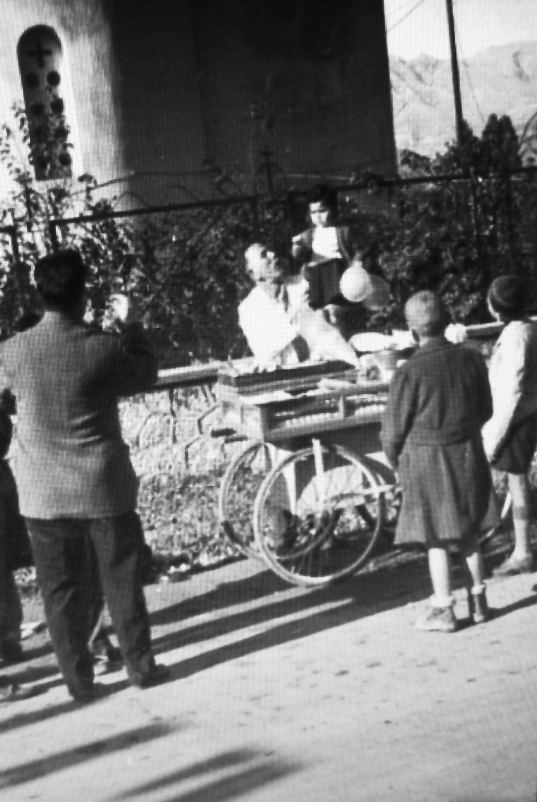 Μετά τον πόλεμο, ξεκίνησε απ’ το μηδέν τον «πόλεμο» της ζωής, πάντα με όπλο του το καροτσάκι του και τον ταβλά (για όπου δεν πήγαινε το καροτσάκι). Δεν θέλησε ποτέ του να γίνει καταστηματάρχης. Δεν το χωρούσε το μυαλό του μπαρμπα-Βαγγέλη ότι κάποιο πρωί θα ‘πρεπε να πάει ν’ ανοίξει την πόρτα ενός μαγαζιού αντί να πιάσει τα χερούλια του καροτσιού του και ντυμένος την άσπρη του μακριά ποδιά και την άσπρη του ζακέτα να γυρίσει τις γειτονιές της Σπάρτης με το γοργό κοφτό του βήμα, διαλαλώντας τη γλυκιά πραμάτεια του, να δει και να χαϊδέψει τα κεφαλάκια των «εγγονιών» του που με το άκουσμα της φωνής του έτρεχαν να τον προϋπαντήσουν.