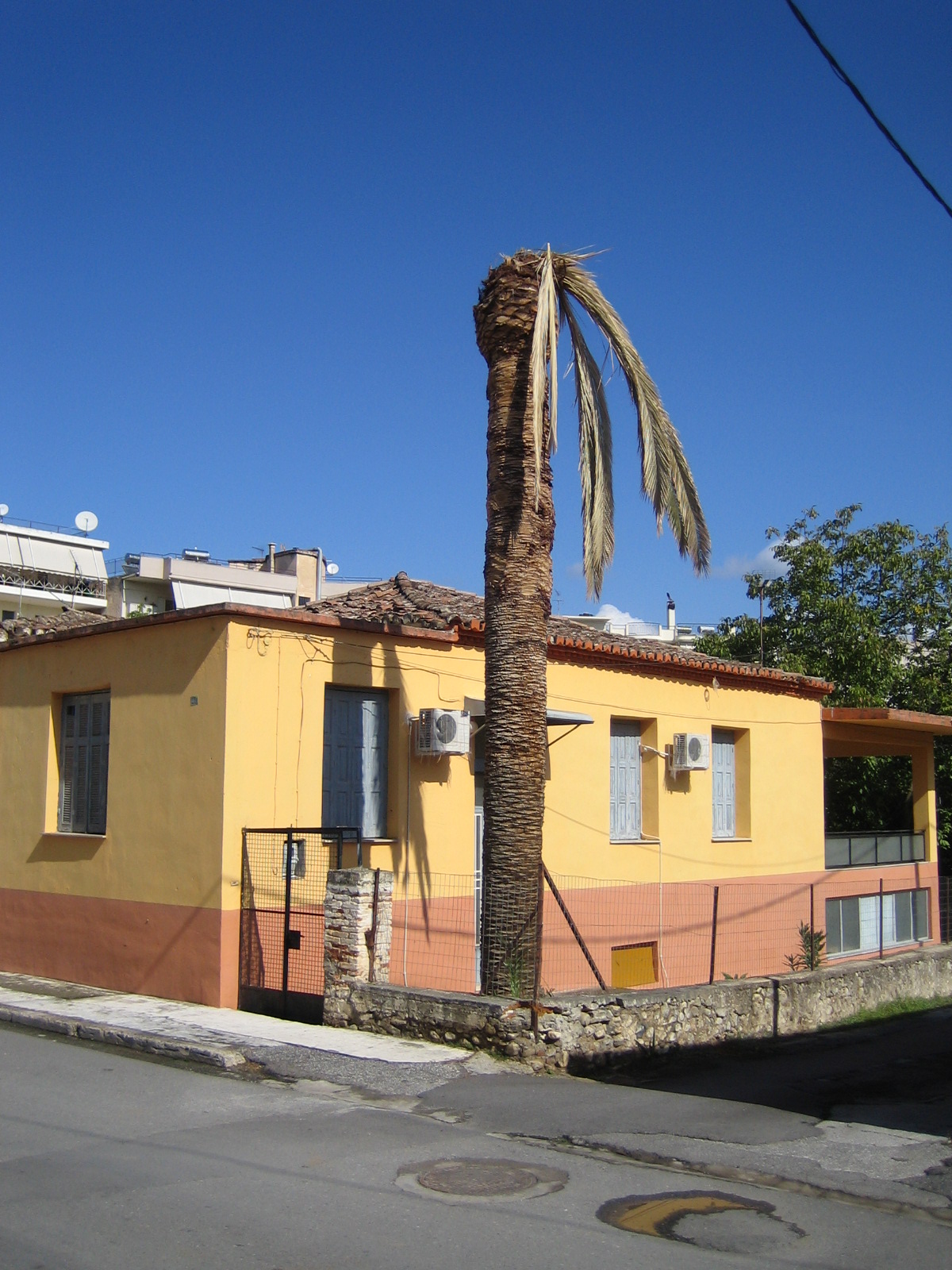 Όταν γεννήθηκα, στα 1954, ο γείτονας ο φοίνικας ήταν ήδη λεβέντης καμαρωτός. Με τα μακριά του κλαδιά απλωμένα αρμονικά γύρω στην κορφή, με τον στέρεο κορμό του γεμάτο με τα συμμετρικά σημάδια που άφηναν τα κλαδιά που γερνούσαν κι έπεφταν από μόνα τους ή τα κλάδευε με το μεγάλο πριόνι ο νοικοκύρης. Αυτά τα κλαδιά, θυμάμαι, τα έπαιρναν οι γείτονες και καθάριζαν τις καμινάδες των τζακιών τους. Επειδή ήταν μακριά και είχαν γύρω-γύρω τα σκληρά φύλλα του φοίνικα, τα έχωναν στην καμινάδα από κάτω από το τζάκι, τα ανεβοκατέβαζαν, τα έστριβαν, κι έπεφτε η καπνιά και καθάριζε το τζάκι, για να μην πιάσει καμιά φωτιά το χειμώνα που λαμπάδιαζαν τα τζάκια. Μια φορά το χρόνο, ο φοίνικας, έβγαζε κάτι μεγάλα τσαμπιά με στρόγγυλους πράσινους καρπούς, σαν χάντρες, που όταν ωρίμαζαν έπαιρναν ένα φωτεινό πορτοκαλί, κεχριμπαρένιο χρώμα και τότε ο φοίνικας καμάρωνε ακόμα πιο όμορφος και στολισμένος με τα γιορντάνια στο λαιμό.