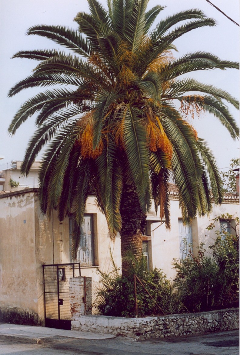 Οι εξωτικοί αυτοί καρποί, που στις μακρινές χώρες του νότου (αυτές που μαθαίναμε στη Γεωγραφία στο σχολείο) ακούγαμε πως τους έλεγαν χουρμάδες και πως εκεί γίνονταν μεγάλοι και γλυκοί και τους έτρωγαν με πολλή ευχαρίστηση οι άνθρωποι με τις άσπρες κελεμπίες και τα μαντήλια τα τυλιγμένα στο κεφάλι, ήταν για μας ένα αξιοθέατο. Δοκιμάζαμε κι εμείς, τα παιδιά της γειτονιάς, τους χουρμάδες του φοίνικα όταν γινωμένοι πια έπεφταν από τα τσαμπιά στο δρόμο, έξωαπό τον φράχτη. Δεν είχαν πολύ φαΐ μέσα τους, ένα τεράστιο καφετί κουκούτσι μόνο, αλλά παίρναμε μια ιδέα από την εξωτική γλυκιά γεύση τους και το άρωμά τους και μπαίναμε κι εμείς νοερά στο καραβάνι που διέσχιζε τη Σαχάρα για να φτάσει στη όαση με το νερό και τις χουρμαδιές.