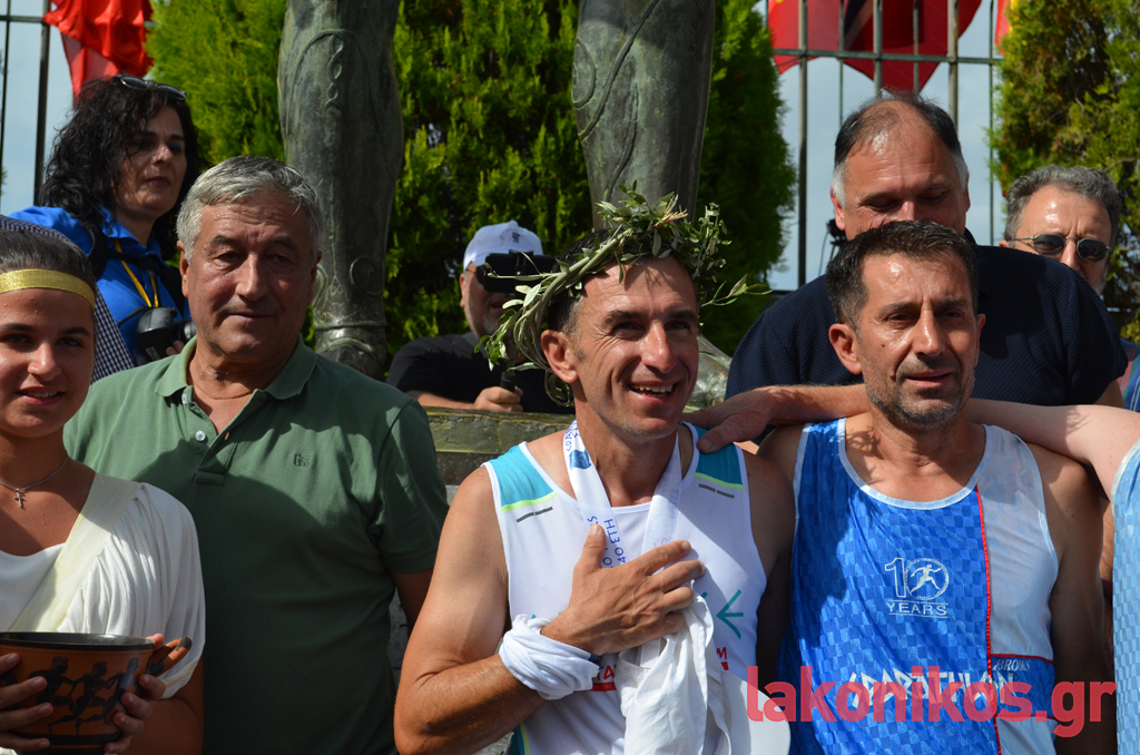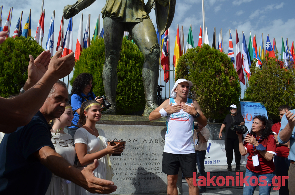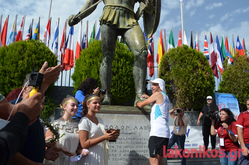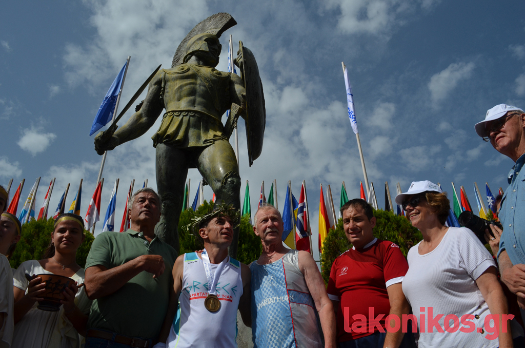 Η Σπάρτη υποκλίθηκε στη φυσιογνωμία του δρομέα Γιώργου Κουλόγιαννη όπως εκείνος υποκλίθηκε στο άγαλμα του Λεωνίδα, κατά τον τερματισμό του στον αγώνα του 40ου Σπάρταθλον.