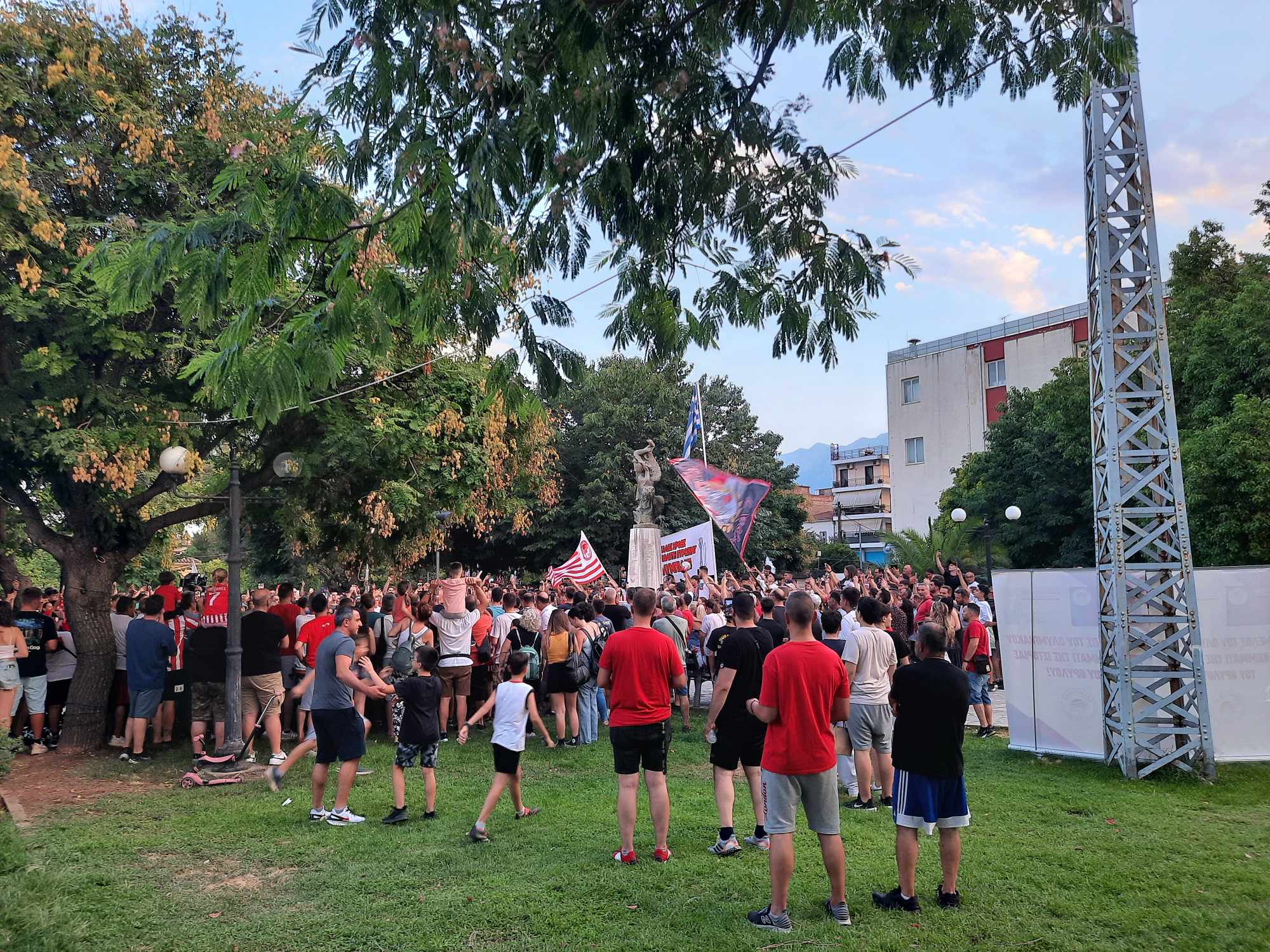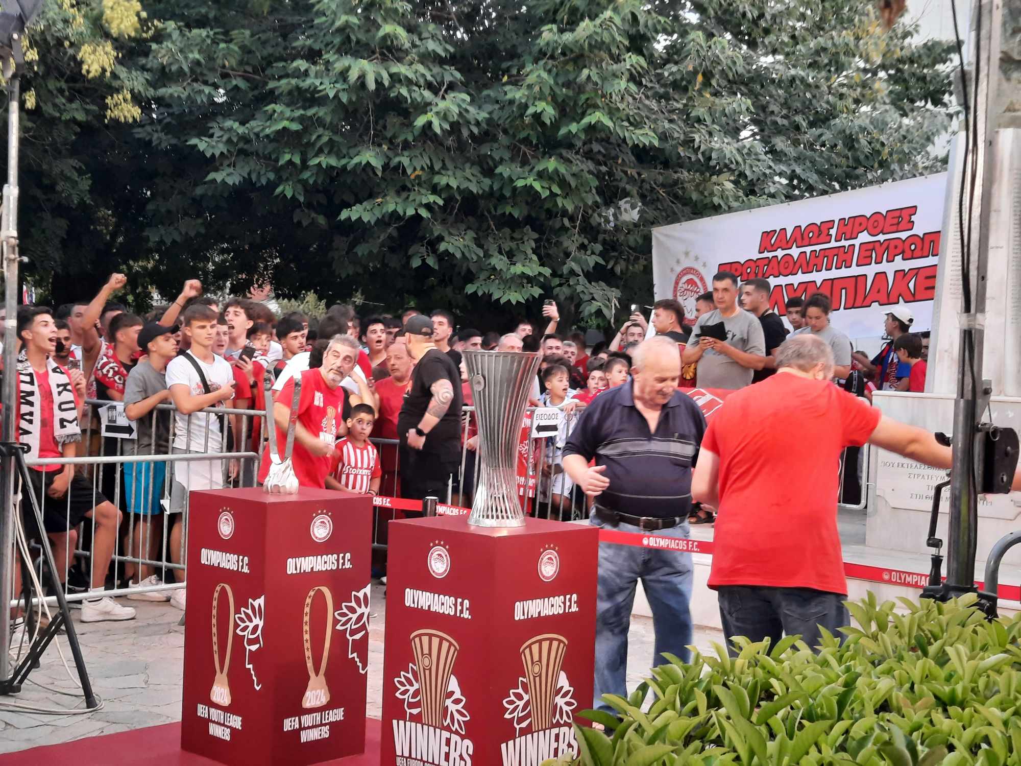 Το πάρκο ΟΤΕ όπου πραγματοποιήθηκε η εκδήλωση στο πλαίσιο της πανελλαδικής περιοδείας των επάθλων, βάφτηκε «ερυθρόλευκο» από τους φίλους των Πειραιωτών. Άνθρωποι διαφόρων ηλικιών κατέκλυσαν από νωρίς τον χώρο για να θαυμάσουν και να βγάλουν φωτογραφίες με τα ιστορικά κύπελλα και να φωνάξουν συνθήματα για την αγαπημένη τους ομάδα. Όταν δε αφίχθησαν τα τρόπαια και τοποθετήθηκαν σε σταντ μπροστά από το ηρώο των 118 πεσόντων του Μονοδενδρίου, επικράτησε πανηγυρική ατμόσφαιρα και αποθέωση από τους φιλάθλους.