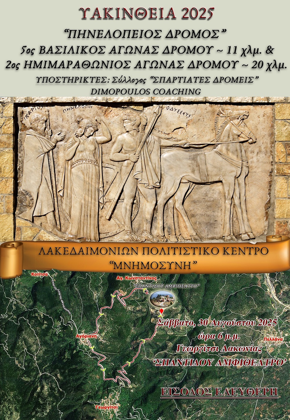 Η «καρδιά» του αθλητισμού και της παράδοσης χτυπά ξανά στο Γεωργίτσι Λακωνίας, με τη διοργάνωση του «Πηνελόπειου Δρόμου 2025», στο πλαίσιο των «Υακινθείων 2025». Ένας θεσμός που έχει καθιερωθεί τα τελευταία χρόνια, επιστρέφει δυναμικά με δύο μοναδικές διαδρομές: τον 5ο «Βασιλικό Αγώνα» των 11 χλμ. και τον 2ο Ημιμαραθώνιο «Πηνελόπειο Δρόμο» των 20 χλμ.