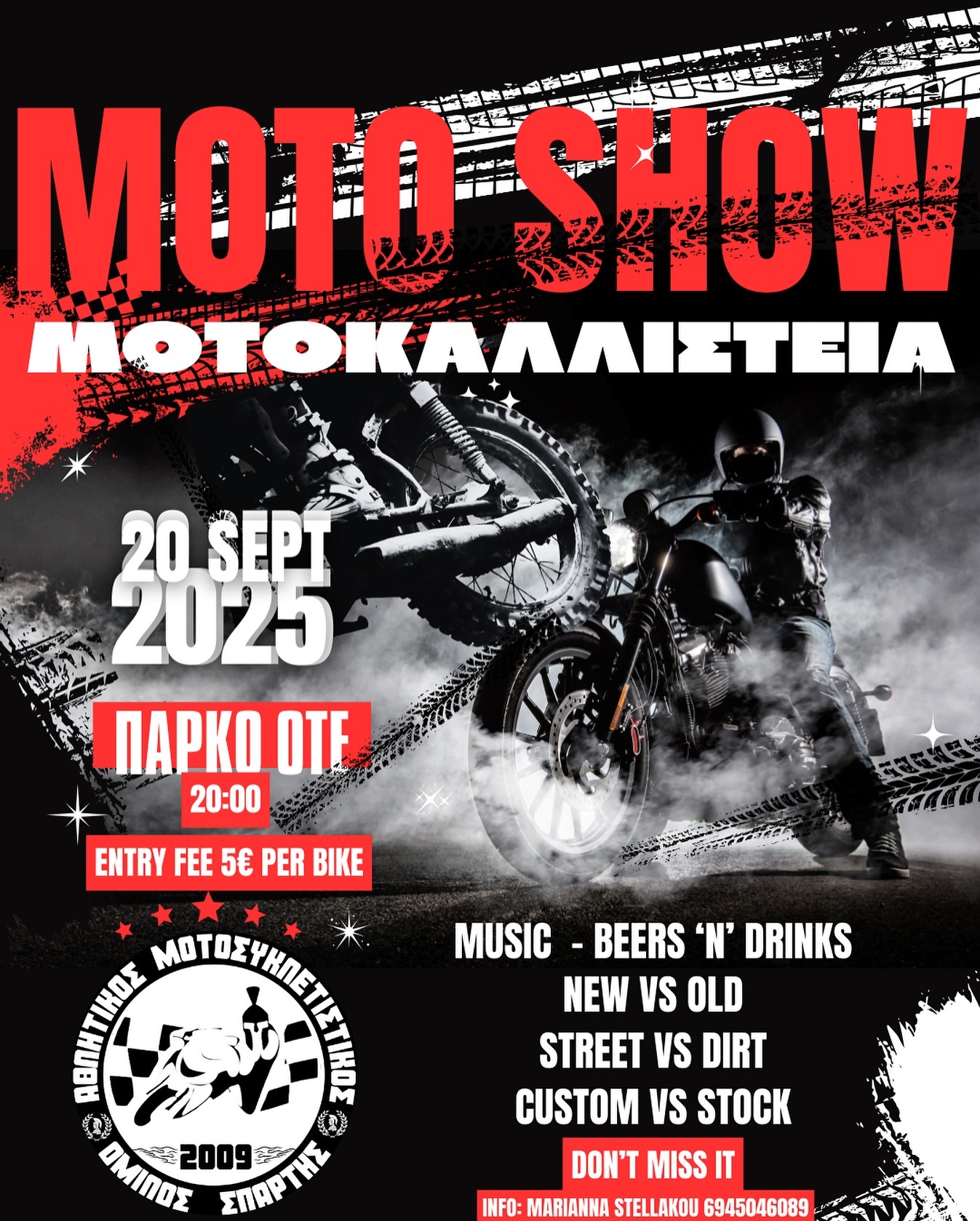Τα φώτα σβήνουν και τα μοτέρ ανάβουν ξανά στη Σπάρτη! Ο Αθλητικός Μοτοσικλετιστικός Όμιλος Σπάρτης (ΑΜΟΣ) επιστρέφει στη δράση με τα «Μοτοκαλλιστεία» του, το δρώμενο που εγκαινίασε πριν μερικά χρόνια και το οποίο έτυχε θερμής αποδοχής από τους φίλους των δίτροχων και όχι μόνο. Το ιδιαίτερο αυτό μηχανοκίνητο σόου θα πραγματοποιηθεί το Σάββατο 20 Σεπτεμβρίου στο Πάρκο ΟΤΕ, περιλαμβάνοντας μουσική, μπίρες-ποτά και φυσικά μοναδικό δίκυκλο θέαμα.