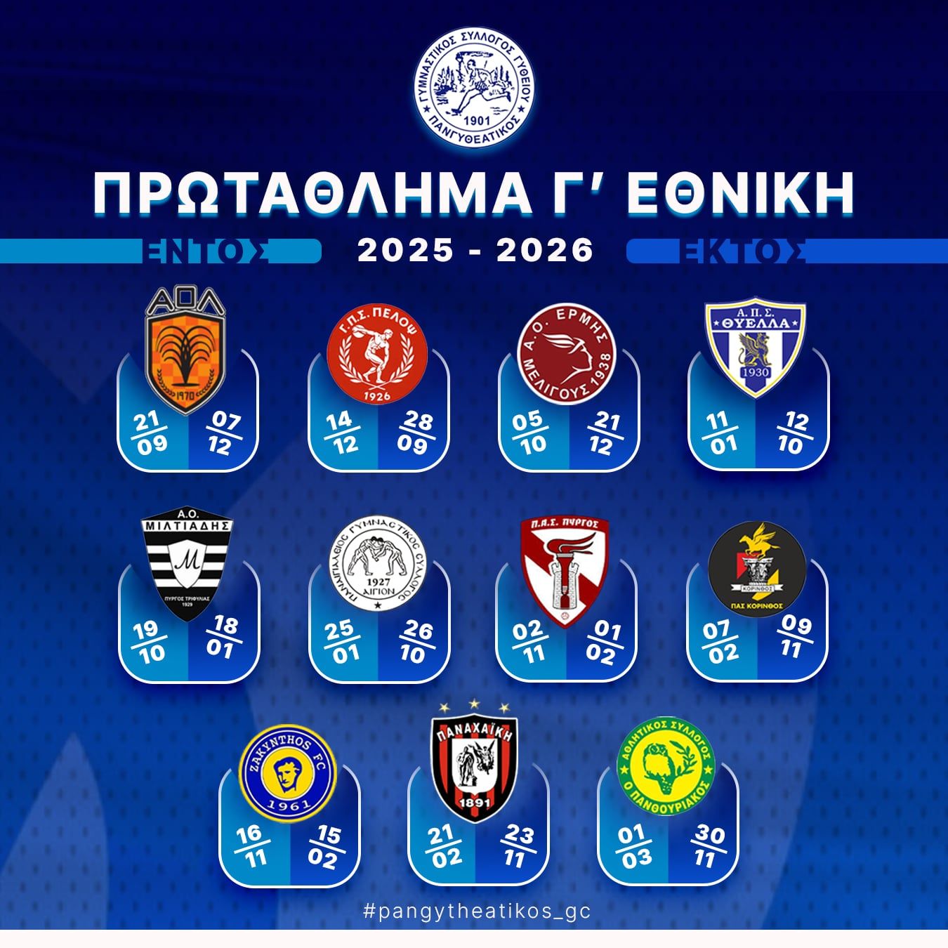 Η Κυριακή 21 Σεπτεμβρίου θα σηματοδοτήσει την έναρξη ενός νέου κεφαλαίου για τον Πανγυθεατικό, με την ομάδα να φιλοδοξεί να συνδυάσει το ταλέντο, την εμπειρία και τον ενθουσιασμό για να διανύσει μια επιτυχημένη ποδοσφαιρική σεζόν. Οι φίλαθλοι καλούνται να γεμίσουν τις κερκίδες και να γίνουν ο καθοριστικός παράγοντας που θα δώσει ώθηση στον σύλλογο του Γυθείου.