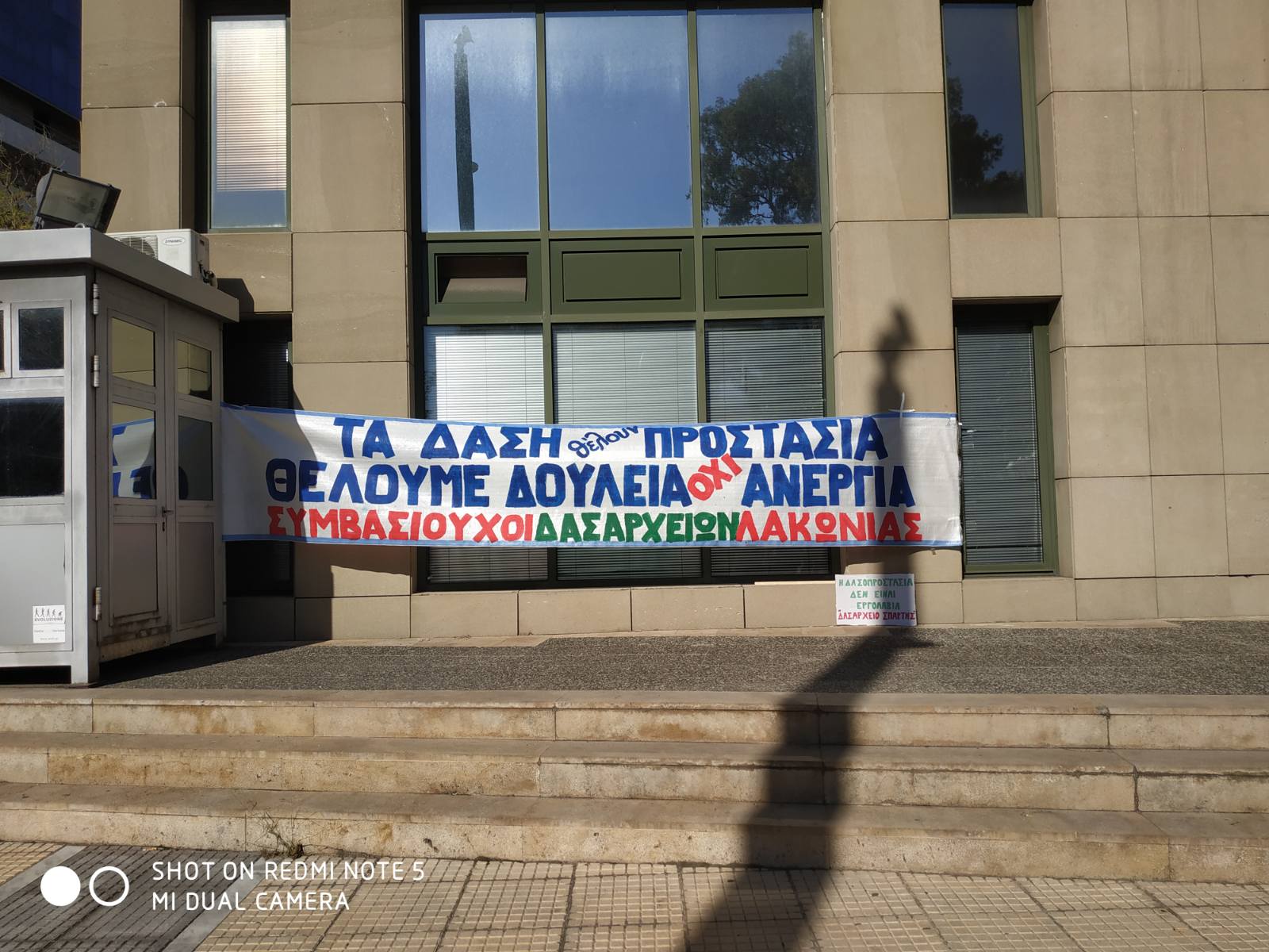 Πανελλαδική κινητοποίηση στο Υπουργείο Περιβάλλοντος πραγματοποίησαν την περασμένη Τετάρτη (6/11) συμβασιούχοι στις δασικές υπηρεσίες της χώρας, ύστερα από κάλεσμα της Πανελλαδικής Συντονιστικής Επιτροπής των Συμβασιούχων στις Δασικές Υπηρεσίες. Στο συλλαλητήριο συμμετείχαν και εργαζόμενοι σε προγράμματα που υλοποιούνται στα δασαρχεία της Λακωνίας.