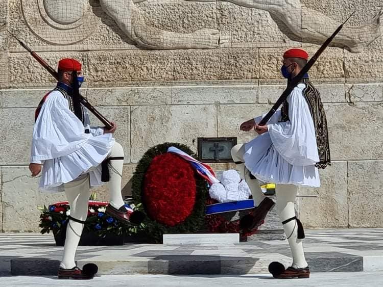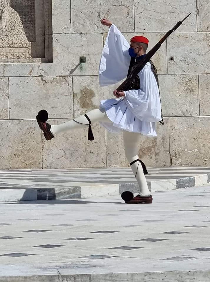 «Οι Εύζωνες κατά τον βηματισμό χτυπούν το τσαρούχι για να ακούνε οι Άγνωστοι νεκροί του Έθνους. Σήμερα κατά την αποχώρηση τους από το Μνημείο, η απόλυτη ησυχία που επικρατούσε, το χτύπημα ακουγόταν ως Σύνθημα, για την νέα αρχή του Ελληνισμού»,