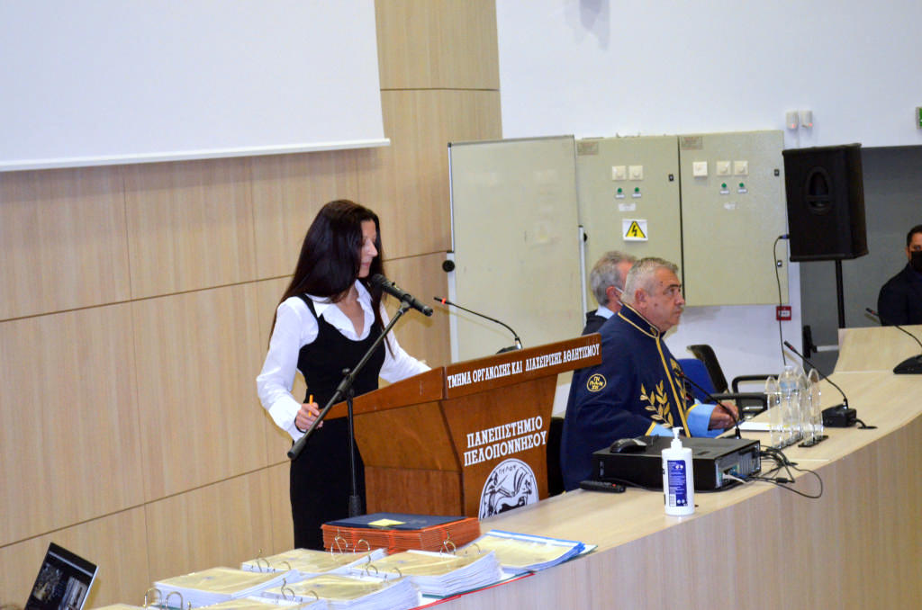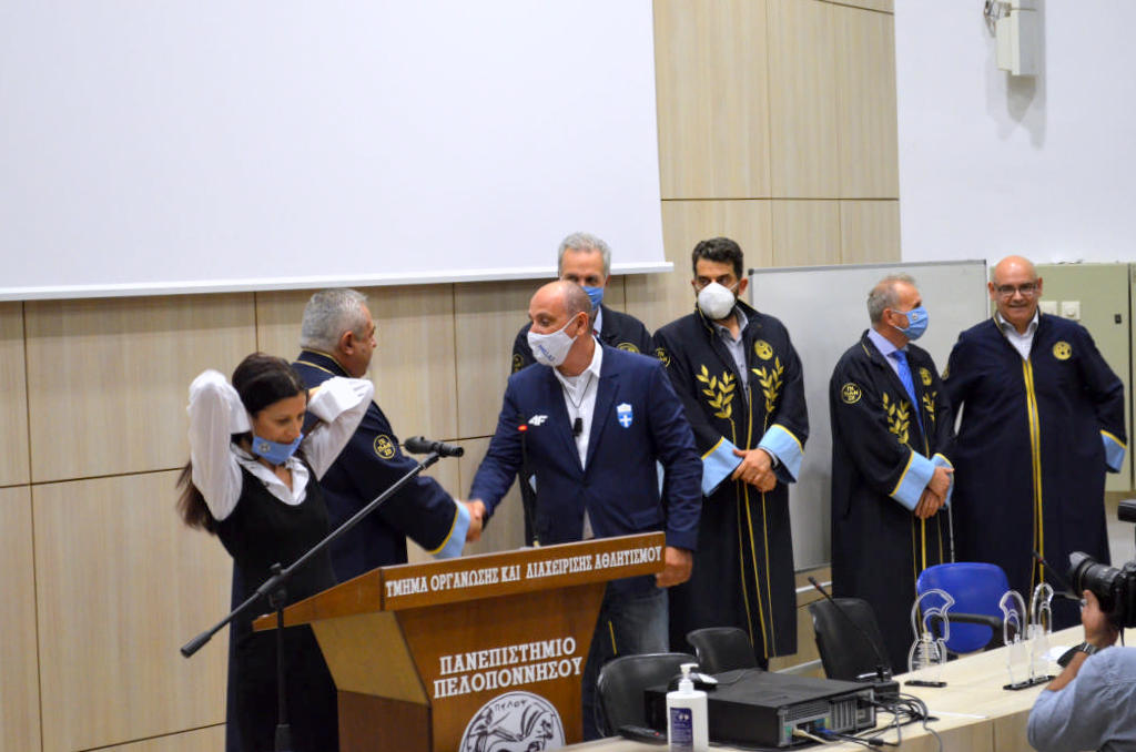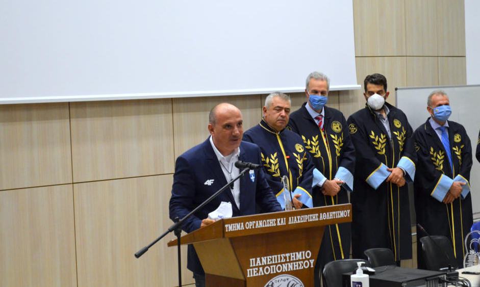 Διαδοχικά χαιρέτισαν τους αποφοίτους ο πρύτανης του Πανεπιστημίου Πελοποννήσου Αθανάσιος Κατσής, ο οποίος μεταξύ άλλων εξέφρασε την ιδιαίτερη τιμή και χαρά του για την εκπροσώπηση -έπειτα από 14 χρόνια- του Υπουργείου Παιδείας και Θρησκευμάτων στην τελετή μέσω της παρουσίας του υφυπουργού. Στη συνέχεια, ο κ. Κατσής βράβευσε τη φοιτήτρια του τμήματος, Αντιγόνη Ντρισμπιώτη, η οποία ήταν 8ης Ολυμπιονίκης του Τόκιο στο βάδην. Από την πλευρά του ο Κοσμήτορας της Σχολής Επιστημών Ανθρώπινης Κίνησης και Ποιότητας Ζωής, Παναγιώτης (Τάκης) Αλεξόπουλος, βράβευσε τον προπονητή της Ολυμπιονίκη, Ναπολέων Κεφαλλόπουλο, ενώ ευχαρίστησε τους επίσημους προσκεκλημένους για την παρουσία τους και τη συμμετοχή τους στην τελετή καθομολόγησης των αποφοίτων. Ο ίδιος τόνισε ότι το τμήμα «συνδυάζει με επιτυχία τη θεωρία με την πράξη, αφού η διοίκηση του αθλητισμού είναι μία κατεξοχήν εφαρμοσμένη επιστήμη η οποία υλοποιεί με απόλυτη συνέπεια τις αρχές των πιο σύγχρονων θεωριών στη διοίκηση, την ψυχολογία, την οικονομία και τις επιστήμες υγείας και με πνεύμα εξωστρέφειας και καινοτομίας συνεχίζει καθημερινά να επενδύει στην ανάπτυξη εκπαιδευτικών και ερευνητικών προγραμμάτων σε συνεργασία με πανεπιστήμια αλλά και στρατηγικούς εταίρους, εστιάζοντας στην επαγγελματική́ σταδιοδρομία των φοιτητών και των φοιτητριών σε εθνικό αλλά και σε διεθνές επίπεδο.»