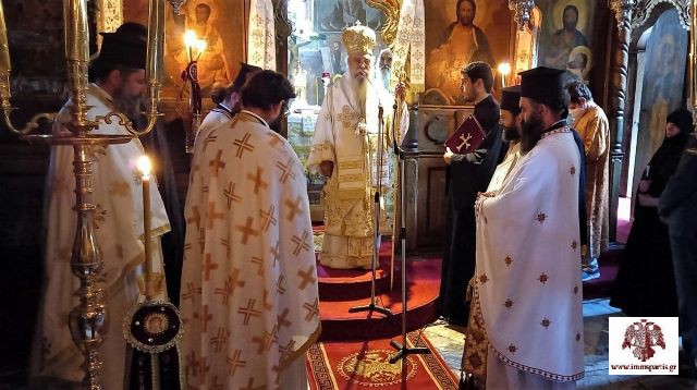 Το απόγευμα της παραμονής τελέστηκε ο μέγας πανηγυρικός αρχιερατικός εσπερινός μετ’ αρτοκλασίας, χοροστατούντος του σεβασμιωτάτου Μητροπολίτη κ. Ευσταθίου και τη συμμετοχή του Καθηγούμενου της ΙΜ Αγίων Τεσσαράκοντα Μαρτύρων, πανοσ. αρχ. Εφραίμ Μιλτιάδου κι αρκετών κληρικών από όμορες περιοχές.