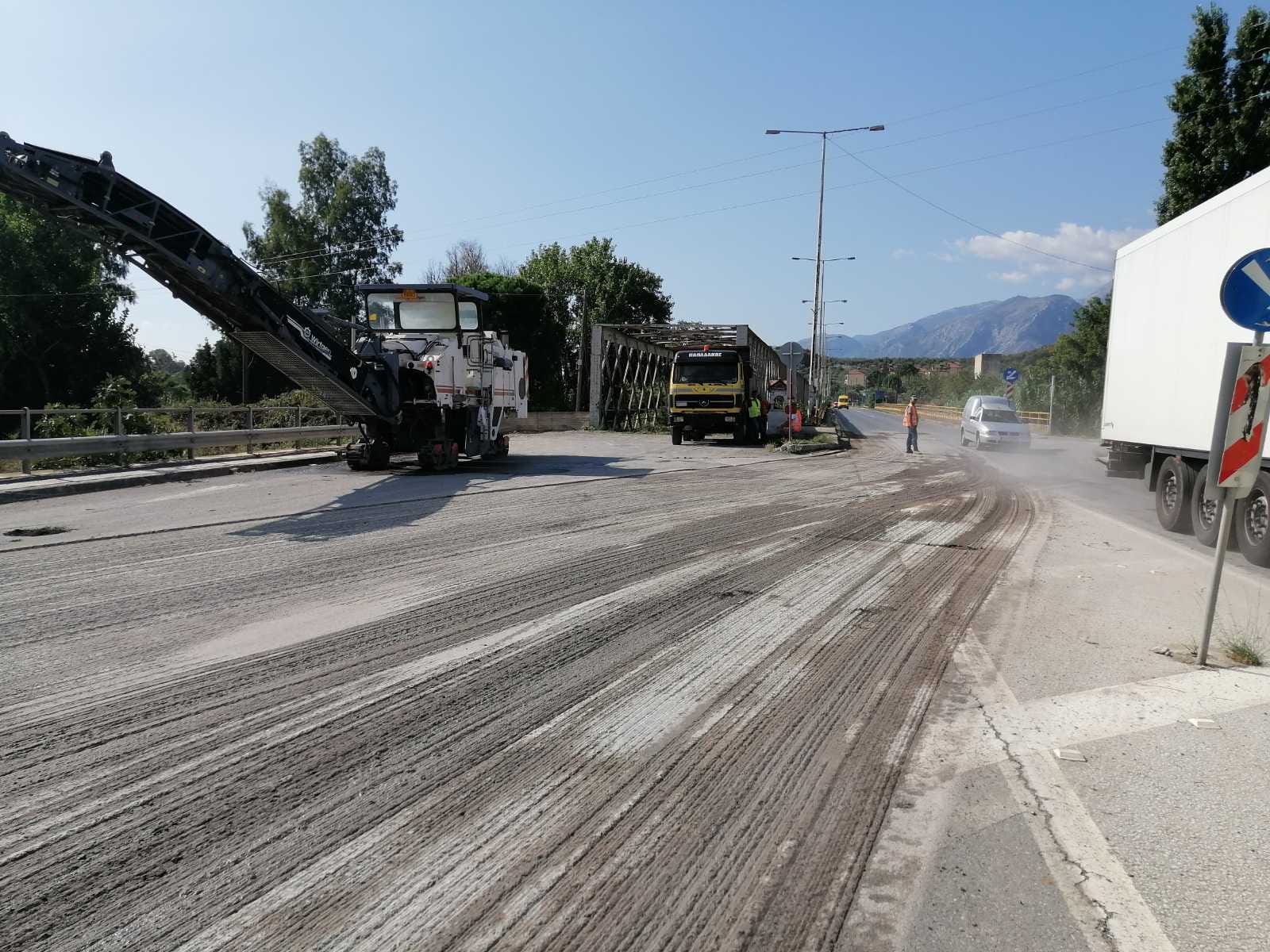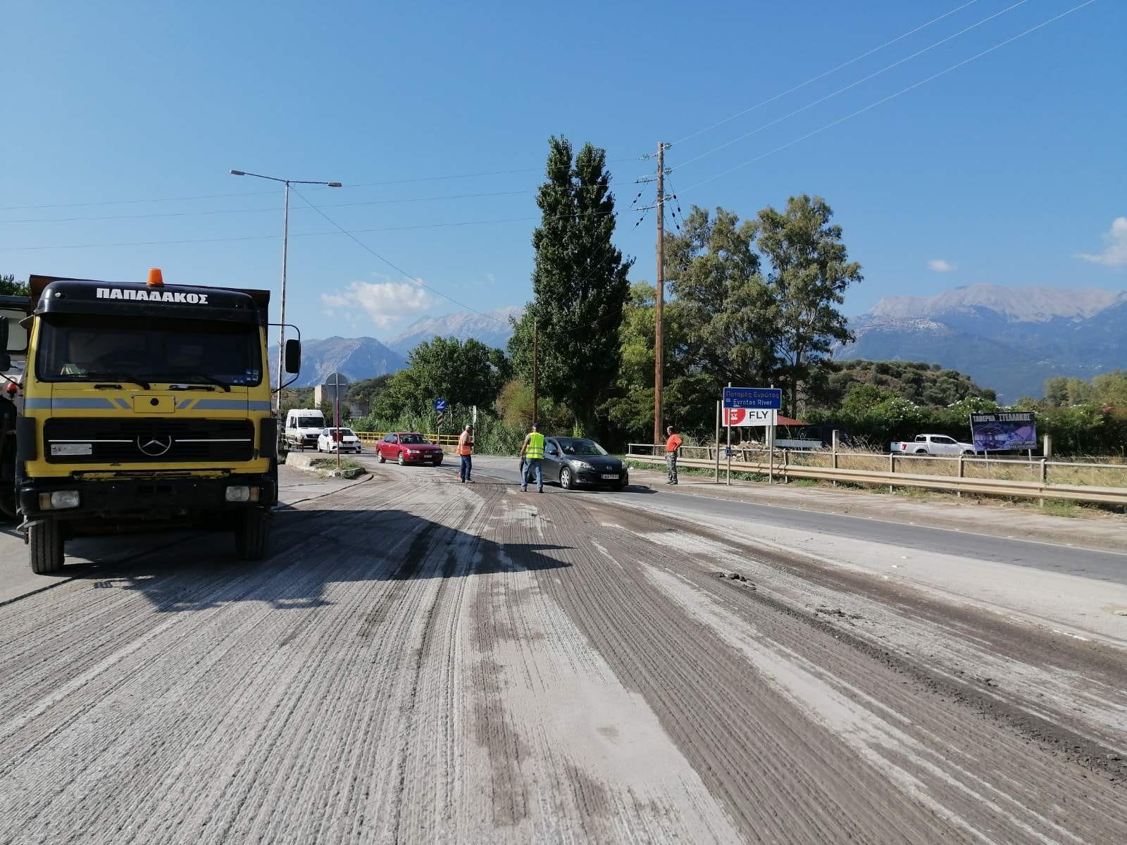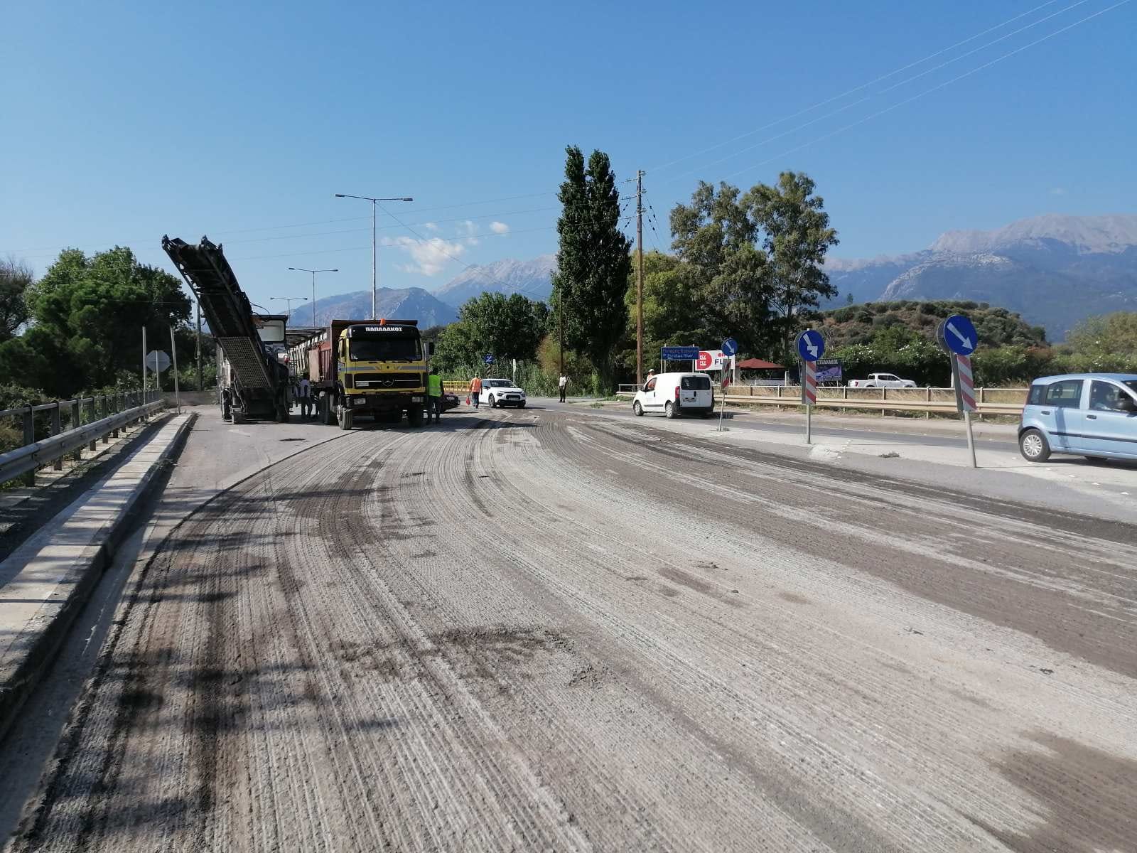 Συγκεκριμένα, εκτελείται αποξήλωση του παλαιού ασφαλτοτάπητα και επίστρωση νέου στο οδικό τμήμα μεταξύ διασταύρωσης προς την ΕπΟ Σπάρτης-Γερακίου και του κόμβου προς Νοσοκομείο. Πιο λεπτομερώς, το έργο περιλαμβάνει την ανακατασκευή του οδοστρώματος στην γέφυρα κυκλοφορίας και στις προσαγωγούς οδούς, την ανακατασκευή των αρμών της γέφυρας, διαγραμμίσεις, κάθετη και οριζόντια σήμανση.