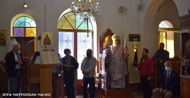 Ο Ιεράρχης Μάνης τέλεσε τη Θεία Λειτουργία, συμπαραστατούμενος από τον εφημέριο του ναού π. Ηλία Λύρα και κήρυξε τον Θείο Λόγο, ερμηνεύοντας την παραβολή του πλουσίου και του πτωχού Λαζάρου, ως περιγράφεται στο κατά Λουκάν Ευαγγέλιο (κεφ. 16 αι στίχοι 19-31).