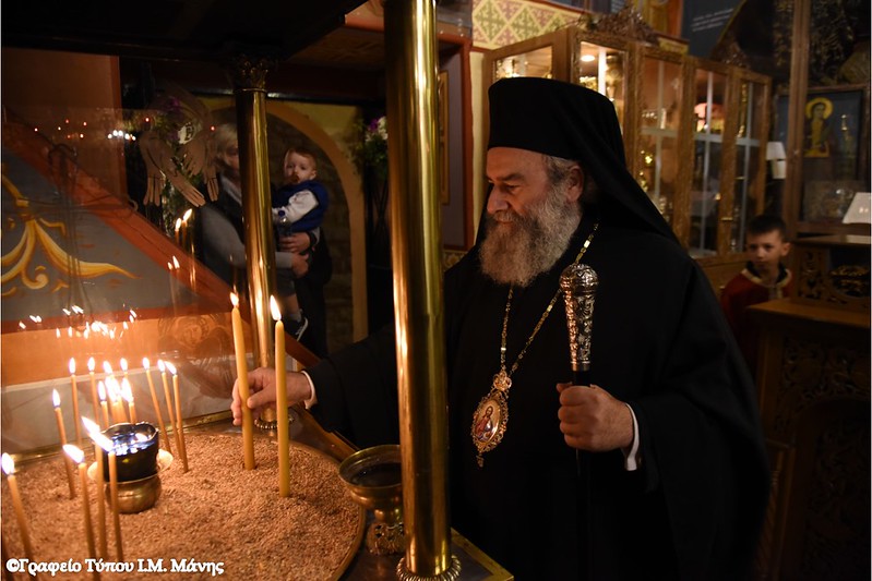 Κατά τον πανηγυρικό δισαρχιερατικό εσπερινό, που τελέστηκε το απόγευμα της Δευτέρας (7/11) στον φερώνυμο ιστορικό ναό της περιοχής, χοροστάτησε ο θεοφιλ. Επίσκοπος Κερνίτσης κ. Χρύσανθος, συγχοροστατούντος του σεβασμιώτατου Μητροπολίτη Μάνης κ. Χρυσοστόμου Γ΄. Στο κήρυγμά του ο Επίσκοπος Κερνίτσης, αφού ευχαρίστησε τον οικείο Μητροπολίτη για την τιμητική του πρόσκληση στην πανήγυρη, μίλησε για τους Αγίους Αγγέλους, χαρακτηρίζοντάς τους «ως φύλακες που οδηγούν τους χριστιανούς στην αλήθεια». Επίσης, αναφέρθηκε στην παρουσία και το έργο τους στην Παλαιά και Καινή Διαθήκη, ενώ κλείνοντας ευχήθηκε οι «Άγγελοι να μας κατευθύνουν προς το καλό και το αγαθό».