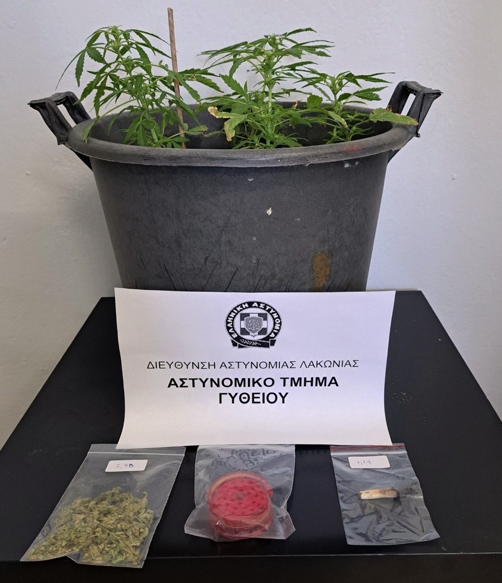 Συνελήφθη κατά τις πρωινές ώρες της Τετάρτης 21/12, σε τοπική κοινότητα του Δήμου Ανατολικής Μάνης, από αστυνομικούς του Αστυνομικού Τμήματος Γυθείου, 57χρονη ημεδαπή, γιατί σε έρευνα που πραγματοποιήθηκε στην οικία της, βρέθηκαν και κατασχέθηκαν 4 δενδρύλλια κάνναβης ύψους έως 19 εκατοστά περίπου, τα οποία καλλιεργούσε σε πλαστική γλάστρα. Βρέθηκαν επίσης και κατασχέθηκαν, ποσότητα κάνναβης συνολικού βάρους 7,98 γραμμαρίων, τσιγαριλίκι και τρίφτης κάνναβης.