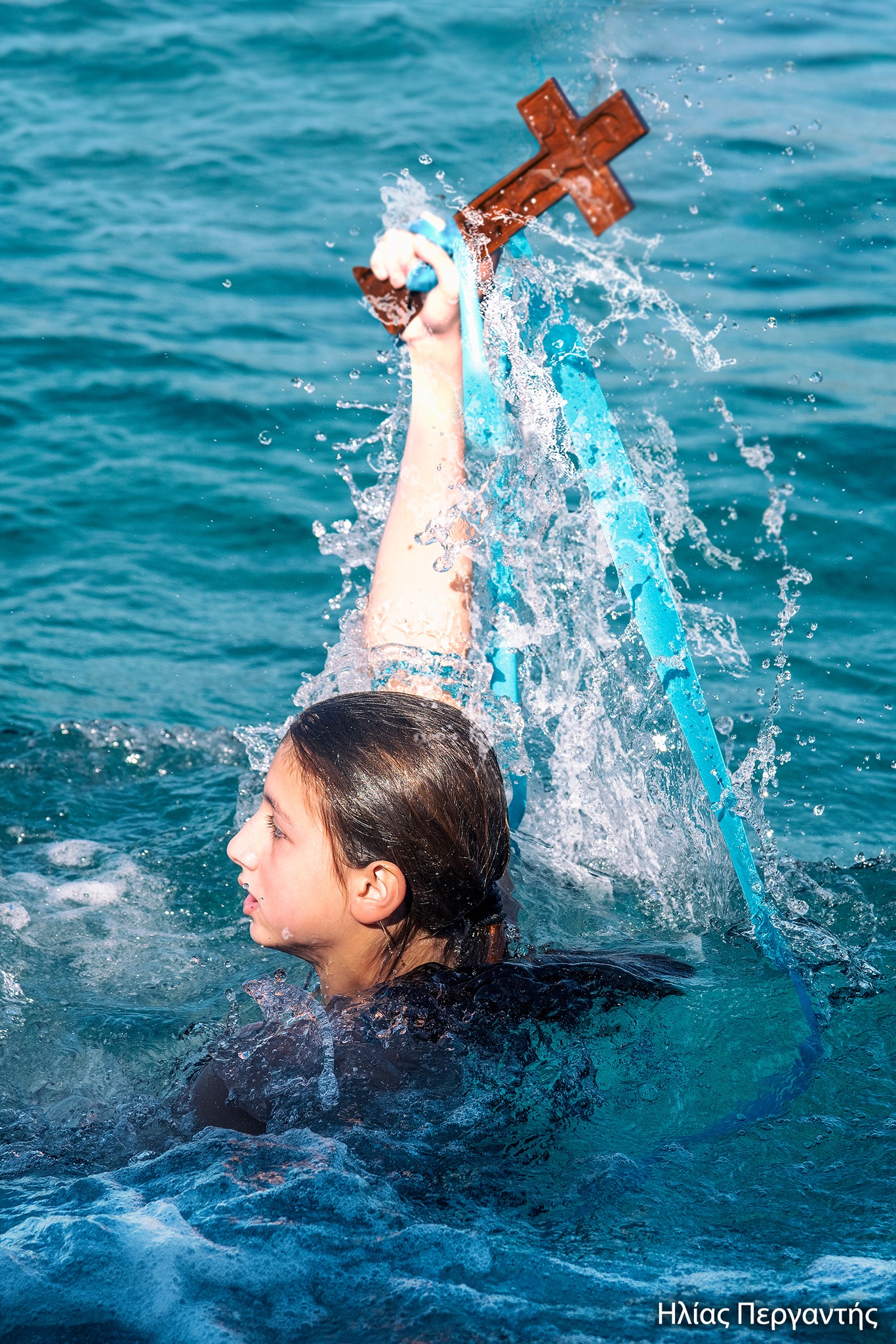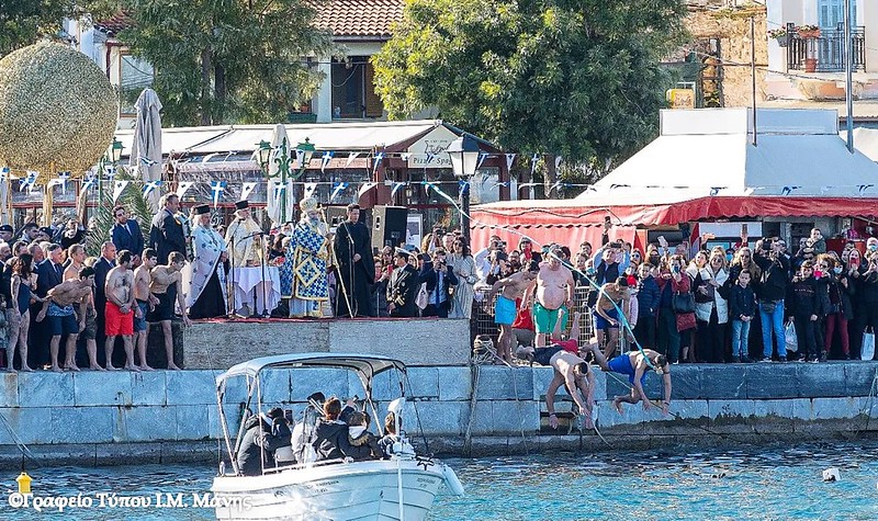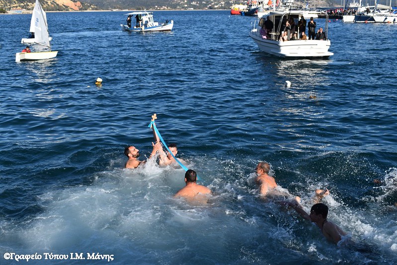 Στη συνέχεια σχηματίστηκε λιτανευτική πομπή που, υπό τους ήχους της Φιλαρμονικής του Δήμου Ανατολικής Μάνης, κατευθύνθηκε προς την αποβάθρα του λιμένα, όπου πραγματοποιήθηκε η κατάδυση του Τιμίου Σταυρού και ο καθαγιασμός των υδάτων. Στη θάλασσα βούτηξαν 14 κολυμβητές, γεμάτοι πίστη και ενθουσιασμό που έλαβαν την ευλογία του Σταυρού από τα χέρια του Μητροπολίτη Χρυσοστόμου Γ’. Τον Τίμιο Σταυρό ανέσυρε ο νέος αγρότης, που υπηρετεί αυτή την περίοδο τη στρατιωτική του θητεία, Παναγιώτης Μαστοράκος.