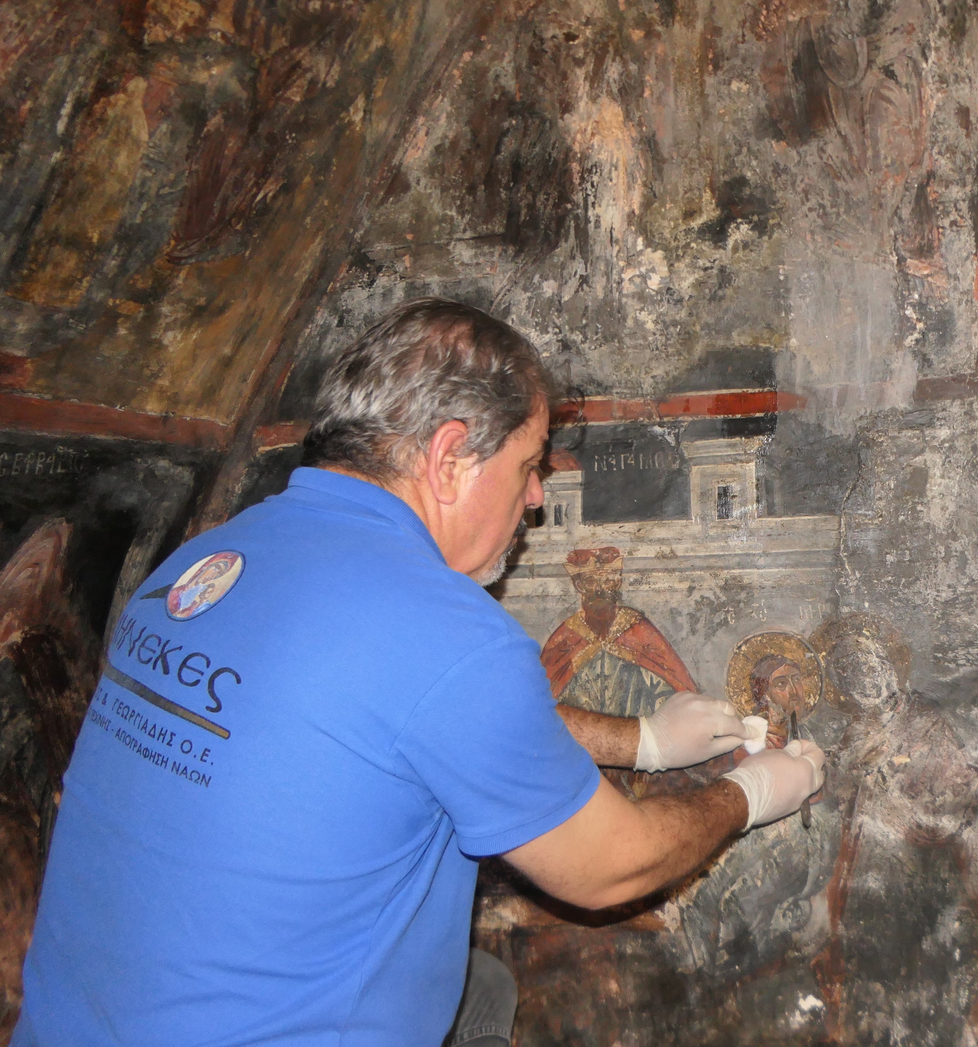 Στο καθολικό της μονής εξελίσσονται επεμβάσεις καθαρισμού των τοιχογραφιών με χημικό και μηχανικό τρόπο, καθώς και στερεωτικές εργασίες για την αποκατάσταση της μηχανικής τους αντοχής.