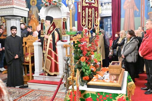 Αφού ευλογήθηκαν οι άρτοι και εψάλησαν τα εγκώμια του Αγίου ενώπιον του αποτμήματος των ιερών λειψάνων του, ο σεπτός Ποιμενάρχης χειροθέτησε εκκλησιαστικούς τέσσερις ευλαβείς νέους της ενορίας. Πρόκειται για τους μαθητές της Α΄ Λυκείου, Παναγιώτη Δημάκο του Ιωάννη, Ευάγγελο Πετράκο του Δημητρίου και Δημοσθένη Ρενέση του Παναγιώτη, καθώς και τον μαθητή της Γ΄ Γυμνασίου, Ευάγγελο Στακιά του Σταματίου.