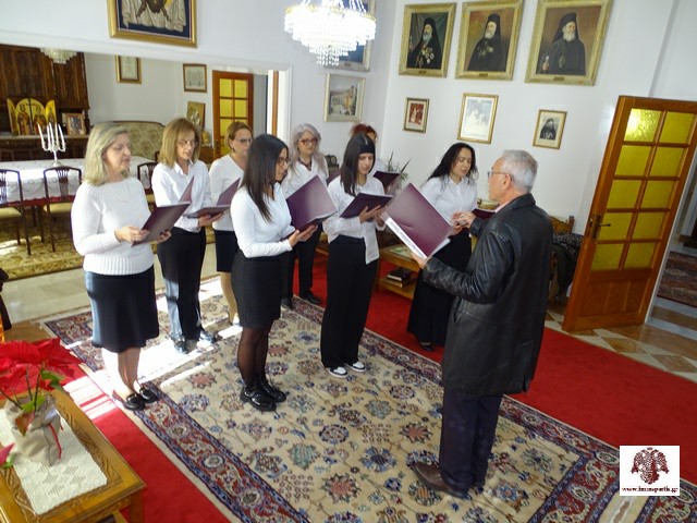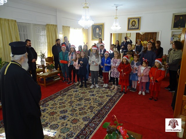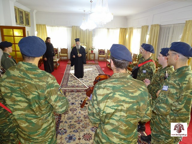 Το πρωί της Παρασκευής 22 Δεκεμβρίου, εξάλλου, ο σεβ. Ποιμενάρχης μας δέχθηκε στο Επισκοπείο τη χορωδία του Στρατοπέδου «Συνταγματάρχη Κωνσταντίνου Δαβάκη», που έψαλε τα παραδοσιακά αλλά και τα βυζαντινά κάλαντα. Ο σεβασμιώτατος ευχαρίστησε την υπαξιωματικό και τους στρατευμένους νέους για την ευγενική χειρονομία τους, ευχήθηκε δε εποικοδομητική θητεία και ο Πανάγαθος Θεός να ευλογεί και να αγιάζει τη ζωή τους.