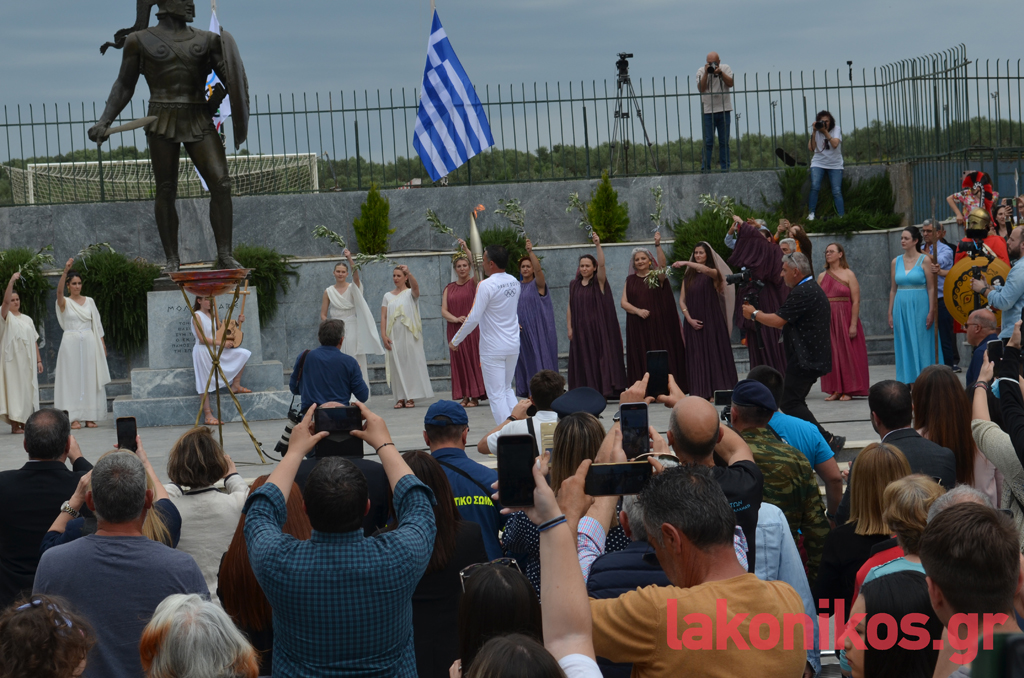 Ο πρόεδρος της Επιτροπής Ολυμπιακής Λαμπαδηδρομίας, Θανάσης Βασιλειάδης, εμφανώς φορτισμένος επεσήμανε: «Διακατεχόμαστε από συγκίνηση, δεδομένου ότι τέσσερα χρόνια πριν, σε αυτή την πλατεία μπροστά σε αυτό τον μεγάλο άνδρα (σσ Λεωνίδα), αναγκαστήκαμε να πάρουμε μια σοβαρή απόφαση και να διακόψουμε μία λαμπαδηδρομία, η οποία έμελε να είναι και το τέλος των Ολυμπιακών Αγώνων του 2020 στο Τόκιο». Σήμερα, «βρισκόμαστε εδώ ανταποκρινόμενοι στη μεγάλη αγάπη των Σπαρτιατών, αλλά πάνω απ’ όλα των ανθρώπων που ηγούνται αυτού του ευλογημένου τόπου, των εθελοντών, των ανωνύμων. Ένα μεγάλο ευχαριστώ. Δεσμευόμαστε να είμαστε και την άλλη φορά εδώ».