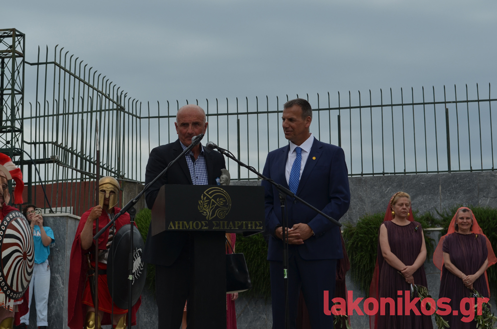 Ο δήμαρχος Σπάρτης, Μιχάλης Βακαλόπουλος, στον χαιρετισμό του καλωσόρισε τους υψηλούς προσκεκλημένους, κάνοντας λόγο για «τη Σπάρτη, την προστάτιδα του Ολυμπισμού και του Ολυμπιακού Ιδεώδους. Πριν από 2.800 χρόνια, ο μεγαλύτερος νομοθέτης του αρχαίου κόσμου, ο Λυκούργος, μαζί με τους βασιλείς της Ήλιδας, Οινόμαο, και Πίσας, Κλεοσθένη, χάραξαν στον δίσκο το ιερό κείμενο της Εκεχειρίας, καθιερώνοντας έτσι το μακροβιότερο σύμβολο Ειρήνης στον αρχαίο κόσμο». Παρατήρησε πως «η έλευση της Φλόγας στη Σπάρτη αποτελεί έμπρακτη αναγνώριση του ιστορικού και πολιτισμικού ρόλου της πόλης μας». «Ένα από τα σημαντικότερα σύμβολα του Ολυμπιακού Κινήματος, με οικουμενική απήχηση, η Φλόγα, βρίσκεται σήμερα εδώ», είπε και συνέχισε: «Και από αυτό το σημείο, το άγαλμα του Λεωνίδα, στέλνουμε σε όλο τον κόσμο το μήνυμα της Ειρήνης. Ειδικά σε μια περίοδο που μαίνονται στον γεωπολιτικό μας χώρο και γειτονιά, συγκρούσεις, οι οποίες μάς ανησυχούν όλους. Στόχος μας είναι να μπολιάσουμε τους νέους με το δέντρο της ειρήνης και της ελπίδας. Να μεταδώσουμε τη δύναμη των αξιών του τόπου μας σε κάθε γωνιά του πλανήτη. Το Ολυμπιακό Ιδεώδες, την πίστη στην αξία του Ανθρώπου, τον σεβασμό στον αντίπαλο, το Ευ Αγωνίζεσθαι, τη συναδέλφωση των λαών και τη διεθνή Ειρήνη». Πλέκοντας το εγκώμιο όλων των συντελεστών, μεταξύ άλλων, επεσήμανε ότι «είμαστε σίγουροι ότι οι φετινοί Ολυμπιακοί Αγώνες στο Παρίσι θα στεφθούν με επιτυχία».