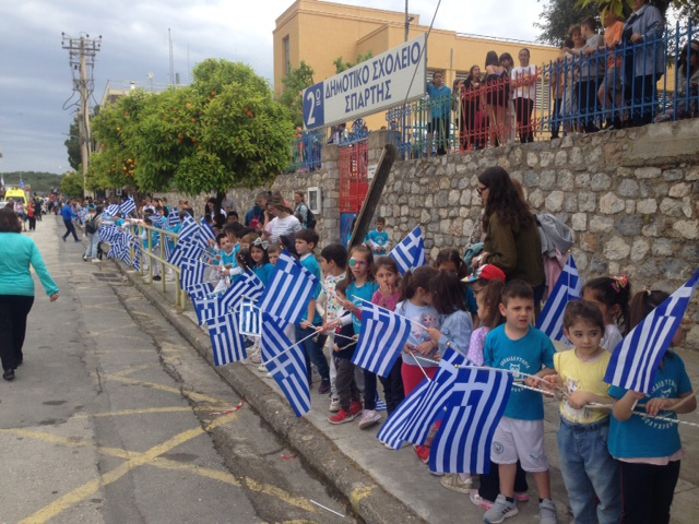 Ακολούθησε μια δωρική και απέριττη τελετή που είχε ετοιμάσει ο Δήμος Σπάρτης, η οποία ξεκίνησε με ανάκρουση του Ολυμπιακού Ύμνου, του Εθνικού Ύμνου της Γαλλίας και του Εθνικού Ύμνου της Ελλάδας, με ταυτόχρονη έπαρση των τριών σημαιών.