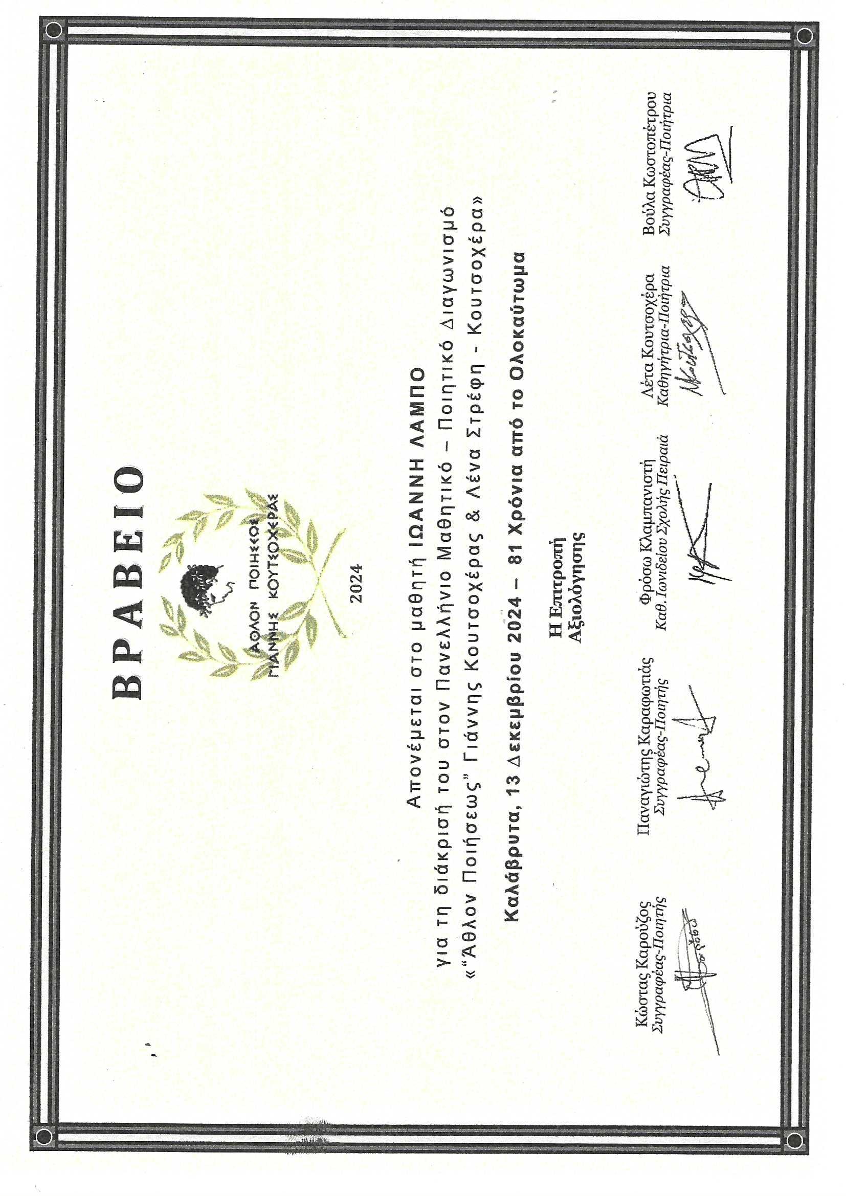 Στον διαγωνισμό που ήταν αφιερωμένος στα 81 χρόνια από το ολοκαύτωμα των Καλαβρύτων από τους Γερμανούς, ο μαθητής του σχολείου της Σκάλας, Ιωάννης Λάμπος, κατάφερε να αποσπάσει το α΄ βραβείο ποίησης. Ο μαθητής απήγγειλε το ποίημα που είχε γράψει και έφερε τον τίτλο «Κουβαλώντας τ’ όνειρο», το οποίο συγκίνησε και ξύπνησε μνήμες στους επιζώντες του ολοκαυτώματος και στους συγγενείς τους.