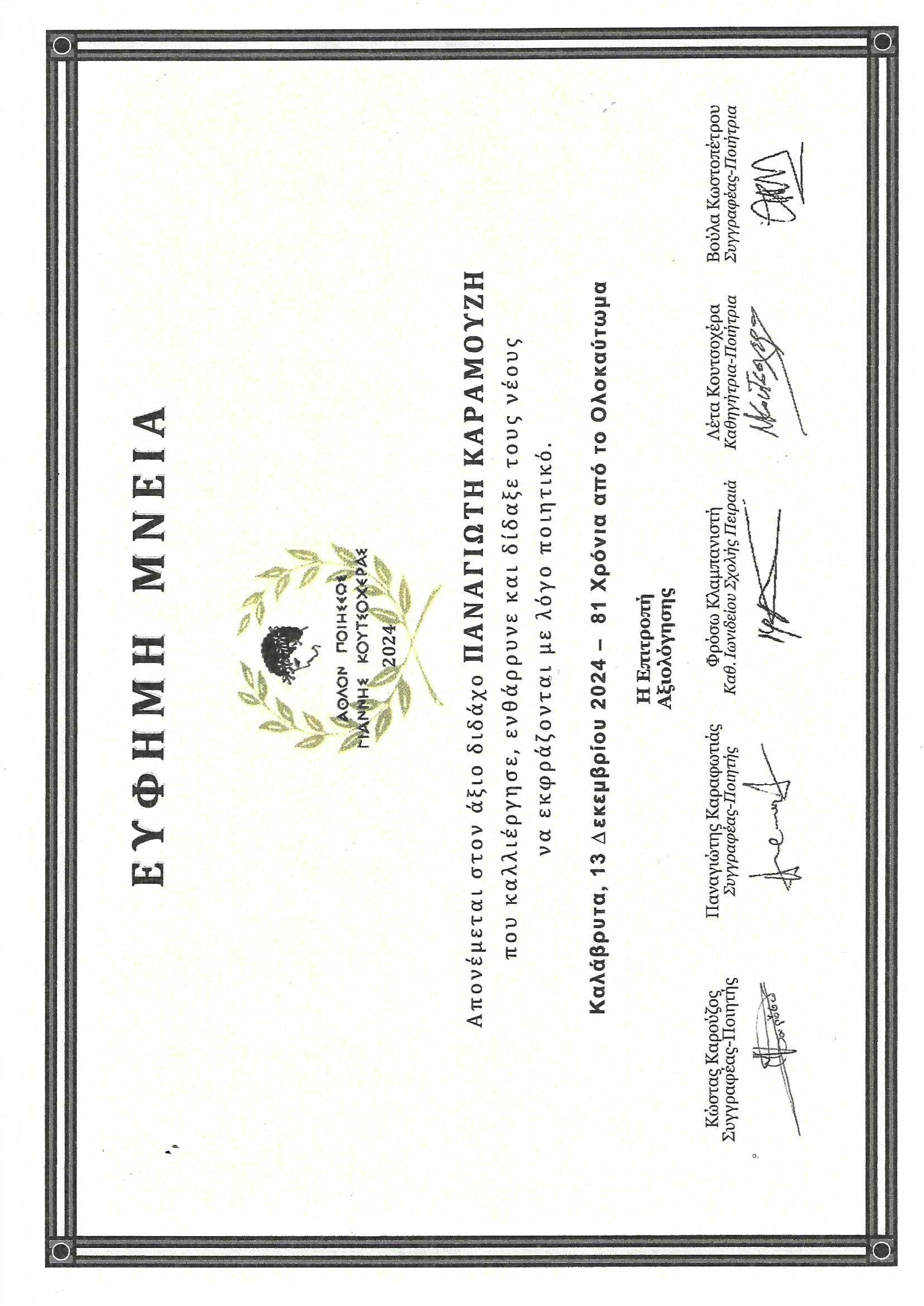 Μία ακόμα σημαντική διάκριση πέτυχε το 1ο Δημοτικό Σχολείο Σκάλας, αυτή τη φορά στον πανελλήνιο διαγωνισμό με τίτλο «Άθλον ποιήσεως Γιάννη και Λένας Στρέφη-Κουτσοχέρα», που διεξήχθη στο Πολυδύναμο Πολιτιστικό Κέντρο Καλαβρύτων, στις 12 Δεκεμβρίου.