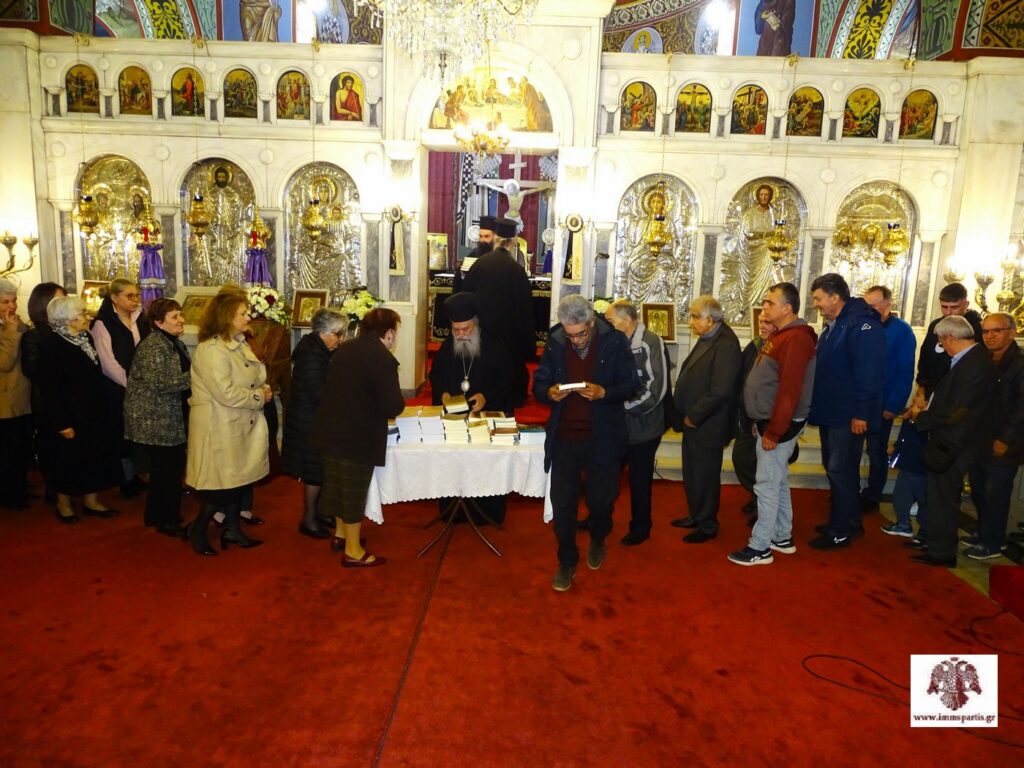 Η εσπερινή λατρευτική σύναξη ολοκληρώθηκε με τον σεβασμιώτατο να προσφέρει σε όλους τους ευλαβείς χριστιανούς, ως ευλογία, βιβλία πνευματικής οικοδομής.