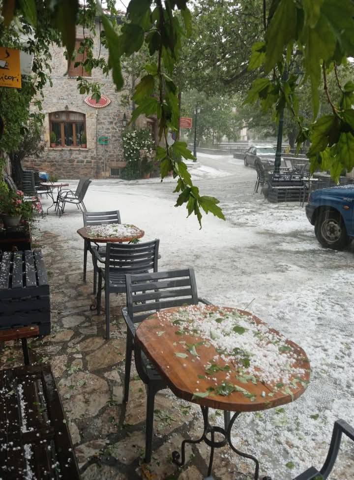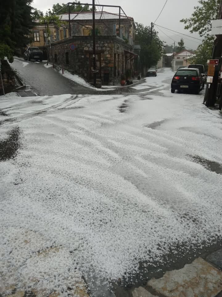Η ξαφνική καταιγίδα συνοδεύτηκε από έντονη χαλαζόπτωση, σε ορισμένες περιπτώσεις, όπως οι Καρυές και η ευρύτερη περιοχή που βρέθηκαν στο επίκεντρο, η Σελλασία, οι Βουτιάνοι κ.α., δημιουργώντας συνθήκες που θυμίζουν φθινοπωρινή-χειμερινή κακοκαιρία και όχι άνοιξη.