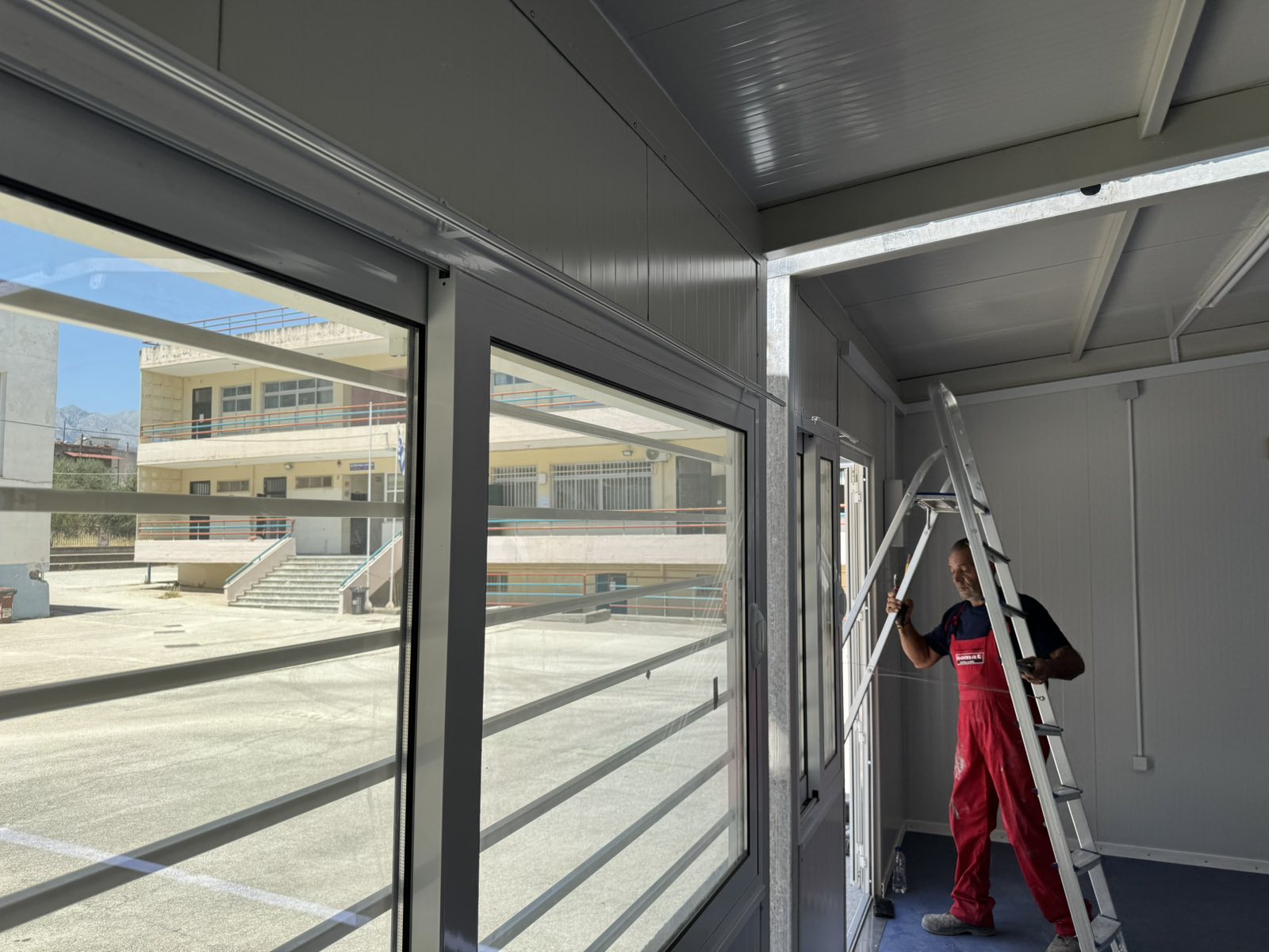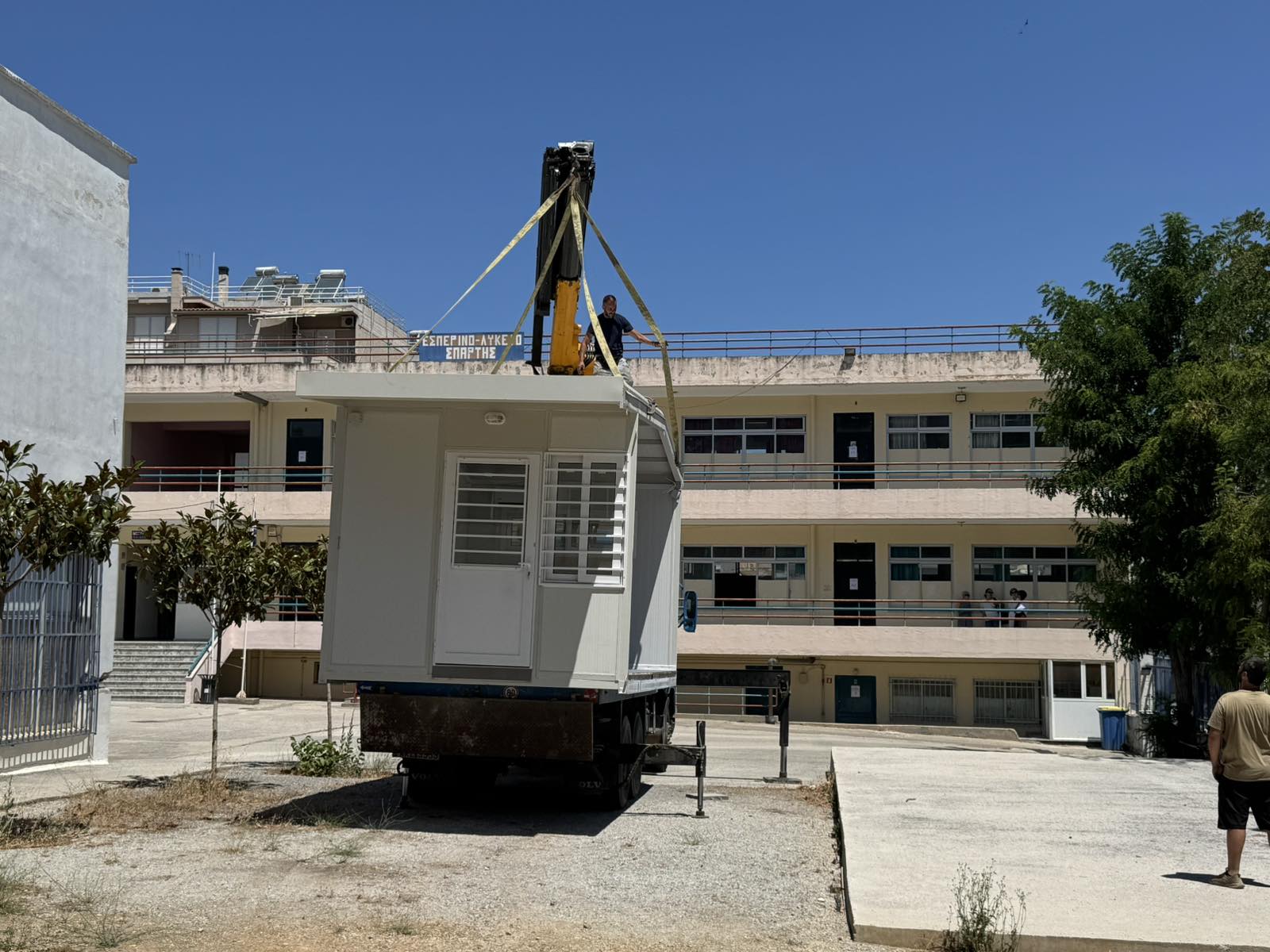 Πιο συγκεκριμένα, ολοκληρώθηκε η τοποθέτηση τριών αιθουσών στον προαύλιο χώρο του Εσπερινού Λυκείου Σπάρτης, όπου συστεγάζεται πλέον και το 1ο Γυμνάσιο.
