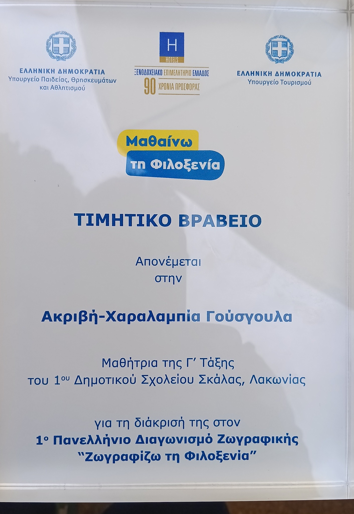 Νέα μεγάλη τιμή για το 1ο Δημοτικό Σχολείο Σκάλας, καθώς η μαθήτρια της μονάδας, Χαραλαμπία-Ακριβή Γούσγουλα, απέσπασε βραβείο στον 1ο Πανελλήνιο Διαγωνισμό Ζωγραφικής του Ξενοδοχειακού Επιμελητηρίου Ελλάδας, με θέμα «Μαθαίνω τη φιλοξενία».