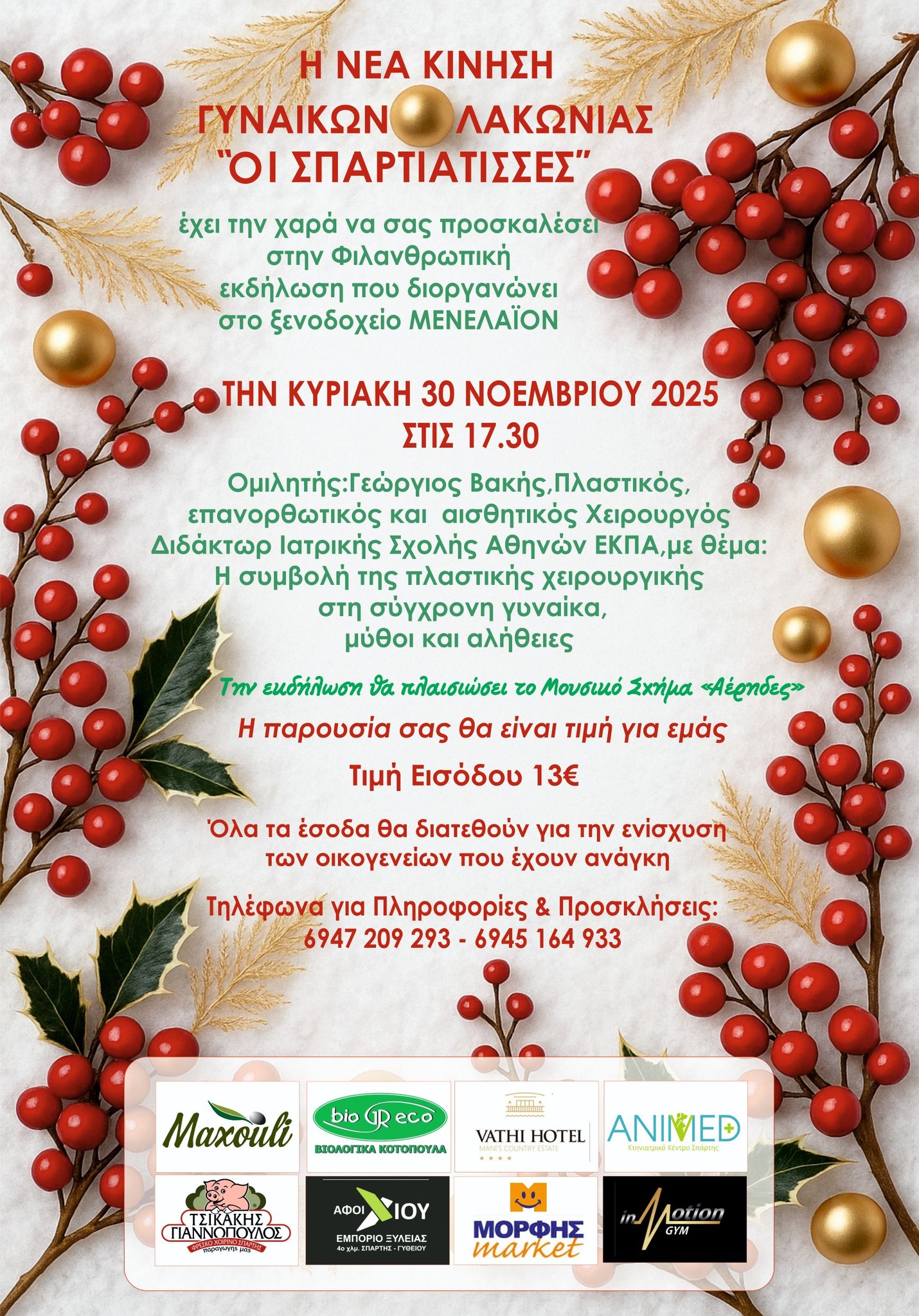 Η Νέα Κίνηση Γυναικών Λακωνίας «Οι Σπαρτιάτισσες» διοργανώνει μία ιδιαίτερα ενδιαφέρουσα και ταυτόχρονα φιλανθρωπική εκδήλωση την Κυριακή 30 Νοεμβρίου, στις 17:30, στο ξενοδοχείο Μενελάιον στη Σπάρτη. Στόχος της δράσης είναι η ενίσχυση οικογενειών της Λακωνίας που βρίσκονται σε ανάγκη, καθώς όλα τα έσοδα θα διατεθούν για φιλανθρωπικούς σκοπούς.