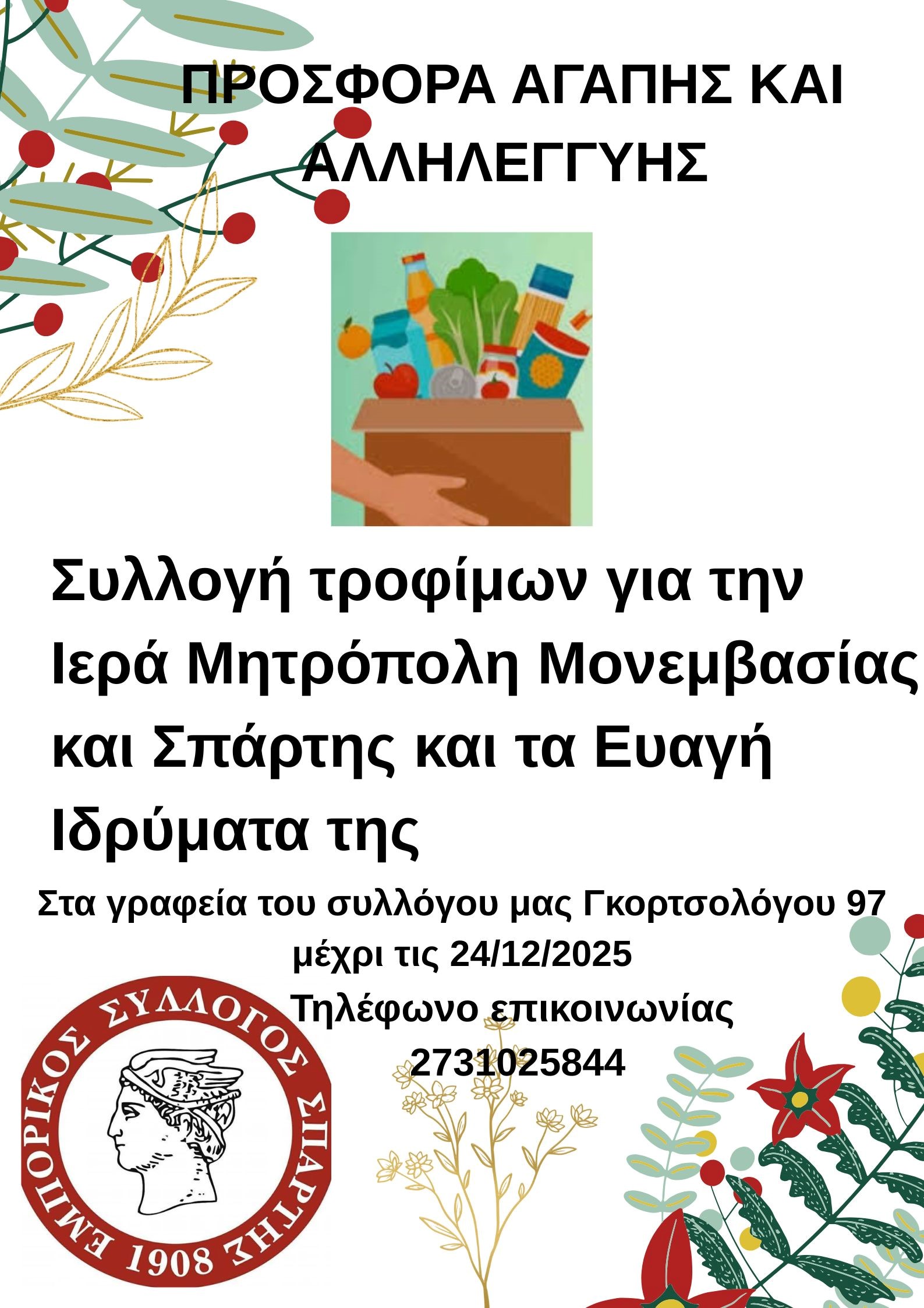 Με αίσθημα αλληλεγγύης και κοινωνικής ευθύνης, ο σύλλογος απευθύνει κάλεσμα στα μέλη του, αλλά και σε όλους τους πολίτες της Σπάρτης να προσφέρουν τρόφιμα μακράς διαρκείας, συμβάλλοντας στο σημαντικό φιλανθρωπικό έργο που επιτελείται με την καθοδήγηση και την ευλογία του σεβασμιωτάτου Μητροπολίτη κ. Ευσταθίου. Η πρωτοβουλία στοχεύει στη στήριξη οικογενειών που δοκιμάζονται, προκειμένου να μπορέσουν να στρώσουν ένα πιο ζεστό και χαρούμενο χριστουγεννιάτικο τραπέζι.