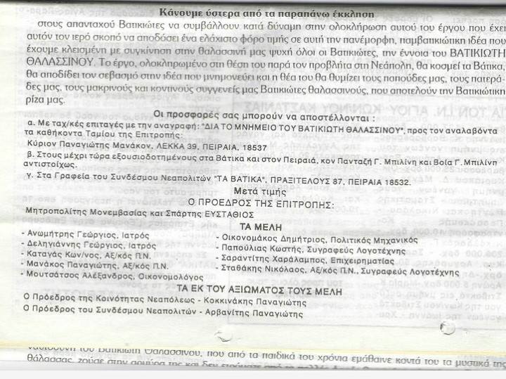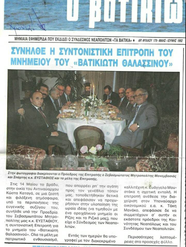 Η Συντονιστική Επιτροπή, με σταθερά μέλη όπως οι Παναγιώτης Μανάκος, Κωνσταντίνος Κατάγας και ο γιατρός Γεώργιος Δεληγιάννης, καθώς και οι πρόεδροι της κοινότητας Νεάπολης και του Συνδέσμου Νεαπολιτών, διαδραμάτισε κρίσιμο ρόλο στη συνολική πραγματοποίηση του έργου. Η πρόταση να ονομαστεί το μνημείο «Βατικιώτης Θαλασσινός» ανήκε στον Γεώργιο Δεληγιάννη, ενώ η ιδέα για την εκτέλεση από τον Μουστάκα προήλθε από τον Αντιναύαρχο Κωνσταντίνο Κατάγα.