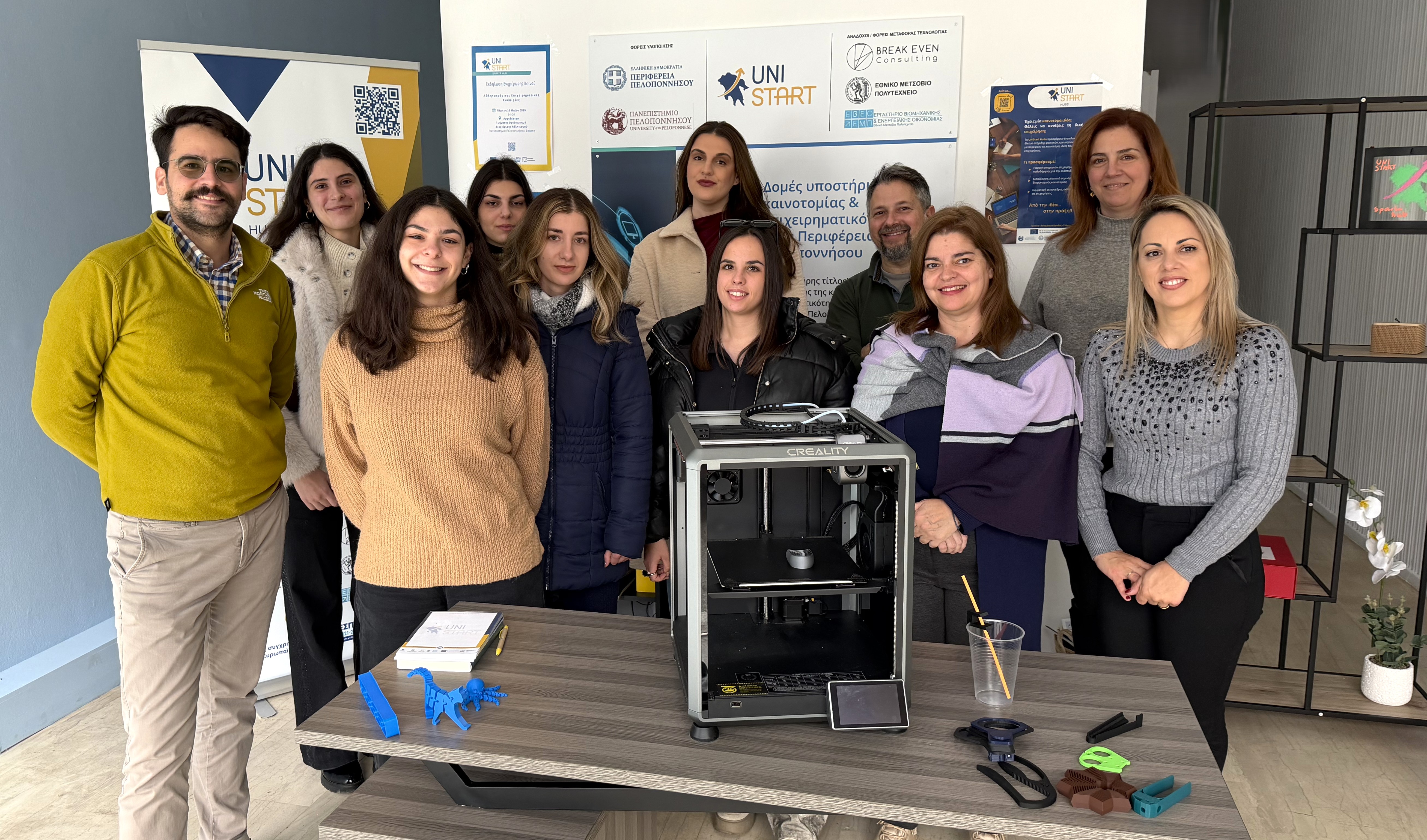 Στο ίδιο πλαίσιο υλοποιήθηκε και δράση εξοικείωσης με τον ειδικό εργαστηριακό εξοπλισμό των UniStart Hubs, με έμφαση στη χρήση τρισδιάστατης εκτύπωσης (3D printing). Οι συμμετέχοντες γνώρισαν πρακτικές εφαρμογές της τεχνολογίας σε εκπαιδευτικά και επιχειρηματικά σενάρια, ενισχύοντας τη βιωματική και πρακτική διάσταση των δράσεων.