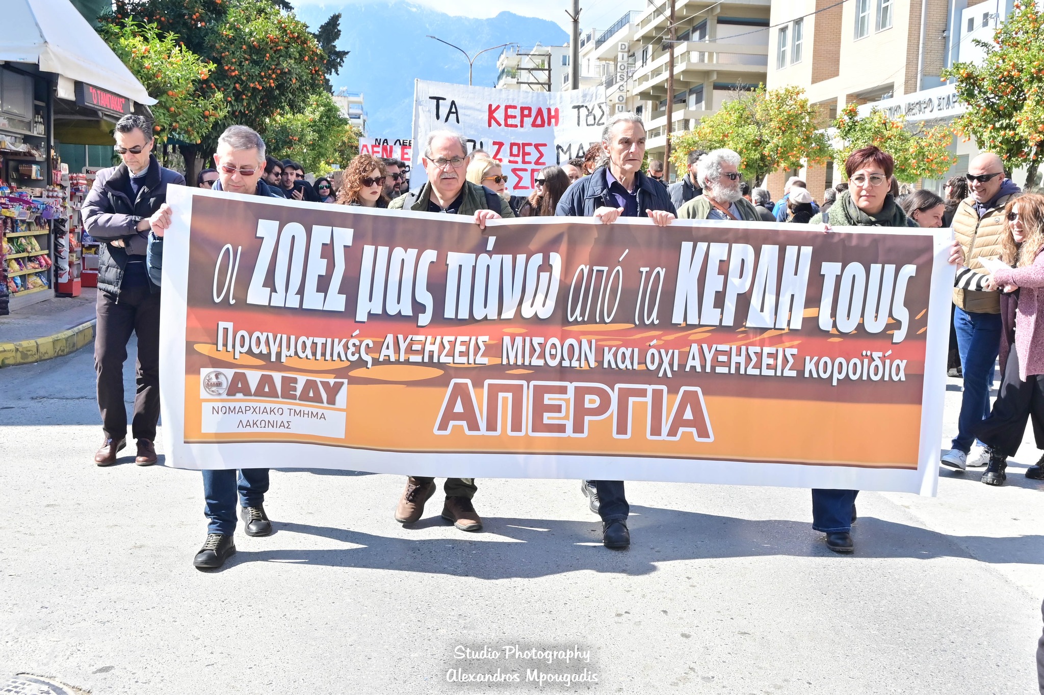 Χαιρετισμούς και ομιλίες απηύθυναν ο πρόεδρος του Εργατοϋπαλληλικού Κέντρου Λακωνίας, Νίκος Μηνακάκης, ο πρόεδρος του ΝΤ Λακωνίας της ΑΔΕΔΥ, Παναγιώτης Κουμουνδούρος, ο γενικός γραμματέας του Σωματείου Συνταξιούχων ΙΚΑ-ΕΦΚΑ, Στάθης Σταθόπουλος, η πρόεδρος της Ένωσης Φοροτεχνικών Λογιστών Λακωνίας, Παναγιώτα Παπαγιαννοπούλου, καθώς και φοιτητές του Πανεπιστημίου Πελοποννήσου στη Σπάρτη.