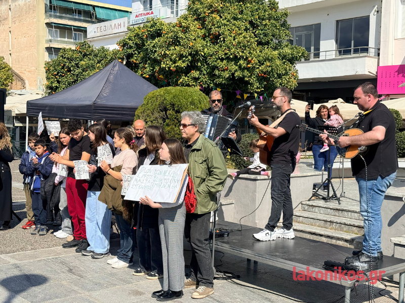 Εν συνεχεία η πομπή επέστρεψε στην κεντρική πλατεία. Η κινητοποίηση ολοκληρώθηκε με μουσική διαμαρτυρία και συναυλία του σχήματος «Γραμμές» σε συνεργασία με το Μουσικό Σχολείο Σπάρτης. Η πιο συγκινητική στιγμή της εκδήλωσης ήρθε στο κλείσιμο, όταν μαθητές του Μουσικού Σχολείου ένωσαν τις φωνές τους με τους μουσικούς και το συγκεντρωμένο πλήθος ερμηνεύοντας το «Της Δικαιοσύνης ήλιε νοητέ», σε μια συμβολική κορύφωση της ημέρας.