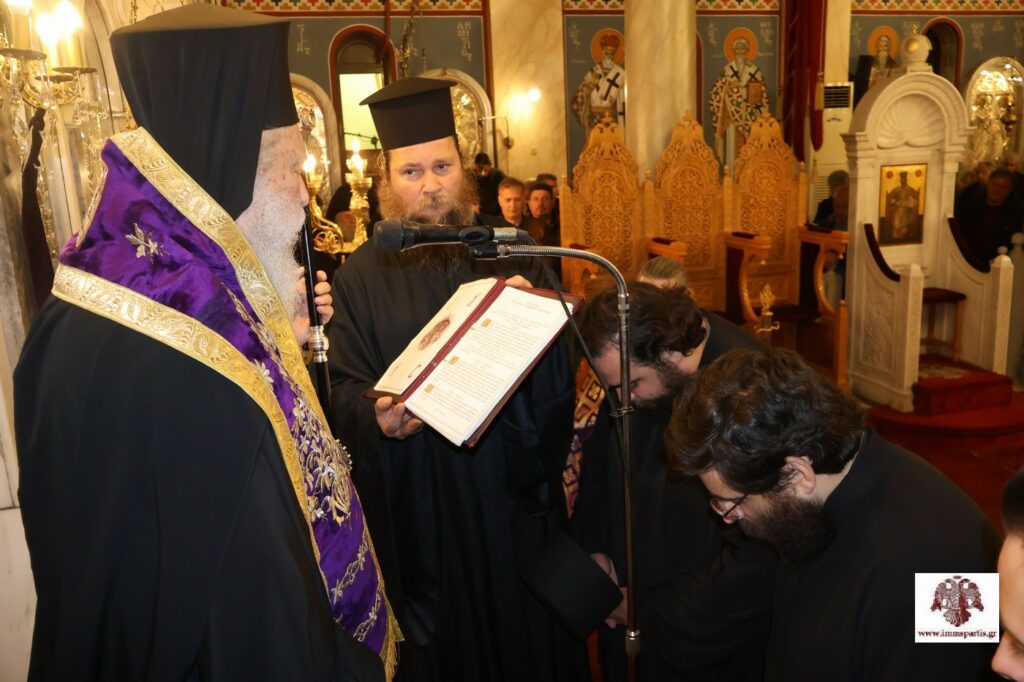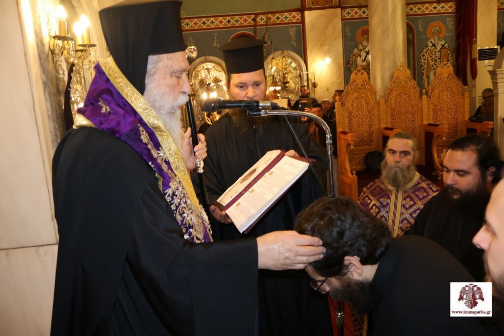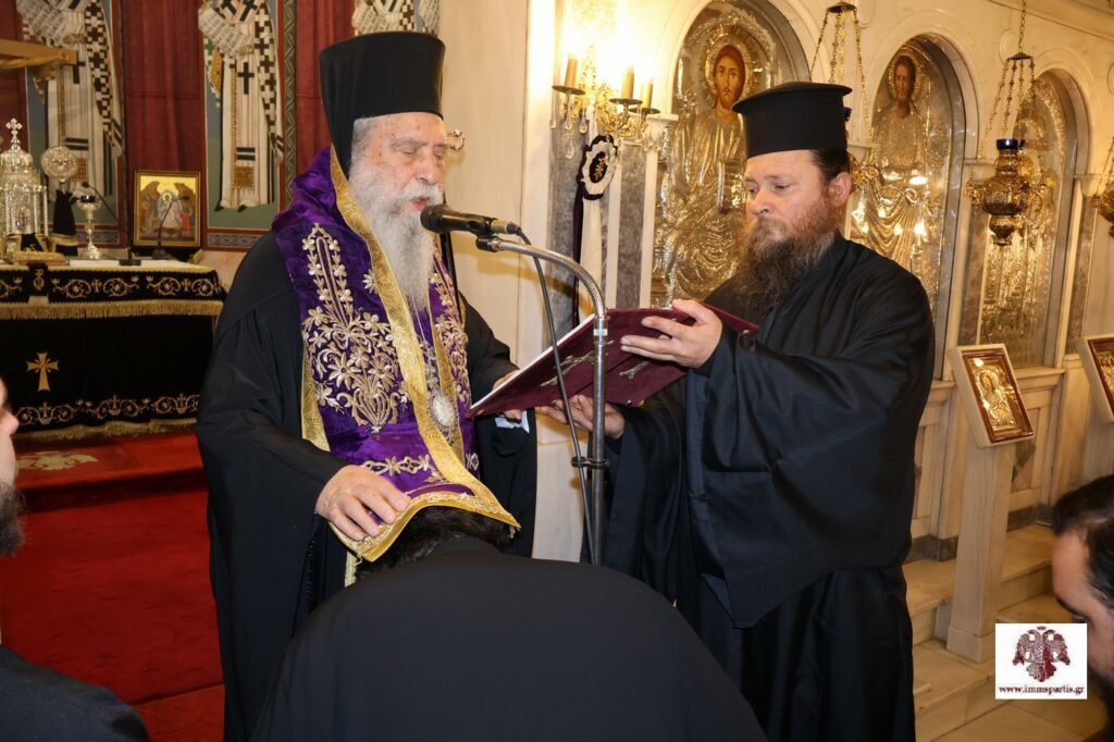 Πριν την ολοκλήρωση της ακολουθίας, πραγματοποιήθηκε η χειροθεσία εις Πνευματικούς δύο Αρχιμανδριτών, μελών της αδελφότητας της Ιεράς Μονής Αγίων Αναργύρων Πάρνωνος, του π. Λεοντίου Βαρδάκη και του π. Νικοδήμου Καρκαμπάση.