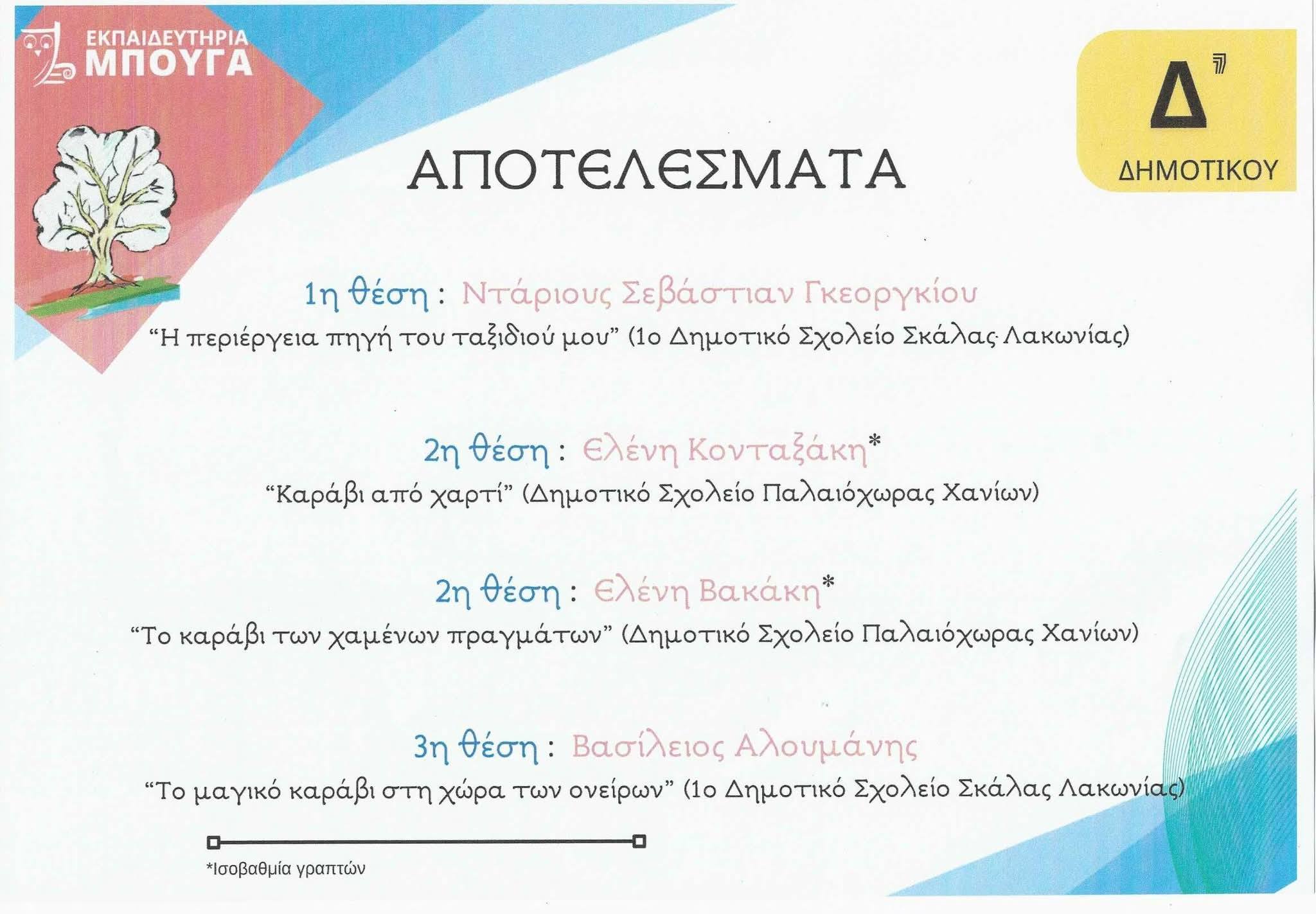 Με τρεις σημαντικές πανελλήνιες διακρίσεις επέστρεψε το 1ο Δημοτικό Σχολείο Σκάλας από τον 15ο Πανελλήνιο Διαγωνισμό Λογοτεχνίας «Το δέντρο της Σοφίας», επιβεβαιώνοντας για ακόμη μία φορά ότι η δημιουργικότητα και η ουσιαστική παιδεία δεν είναι απλώς ζητούμενα, αλλά καθημερινή πράξη μέσα στην τάξη.