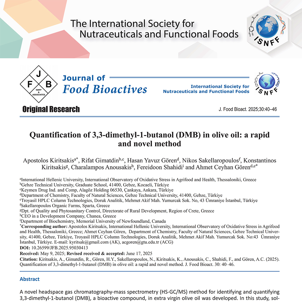 Στις 30 Ιουνίου 2025, η διεθνής επιστημονική ομάδα αποτελούμενη από 4 Έλληνες, 3 Τούρκους κι έναν Καναδό (και συγκεκριμένα τους: Rifat Gimatdin, Hasan Yavuz Gören, Νίκο Σακελλαρόπουλο, Κωνσταντίνο Κυριτσάκη, Χαράλαμπο Ανουσάκη, Fereidoon Shahidi, Ahmet Ceyhan Gören), με επικεφαλής τον Ομότιμο Καθηγητή του Διεθνούς Πανεπιστημίου Ελλάδας, Απόστολο Κυριτσάκη, δημοσίευσε στο διεθνές επιστημονικό και έγκριτο περιοδικό Βιοδραστικών Συστατικών Τροφίμων (Journal of Food Bioactives - JFB), που ανήκει στις δημοσιεύσεις της Διεθνούς Εταιρείας για τα Διατροφοφάρμακα και τα Λειτουργικά Τρόφιμα (International Society for Nutraceuticals and Functional Foods - ISNFF), τα εντυπωσιακά αποτελέσματα της πρωτοποριακής μελέτης υπό τον γενικό τίτλο «Quantification of 3,3-dimethyl-1-butanol (DMB) in olive oil: a rapid and novel method».