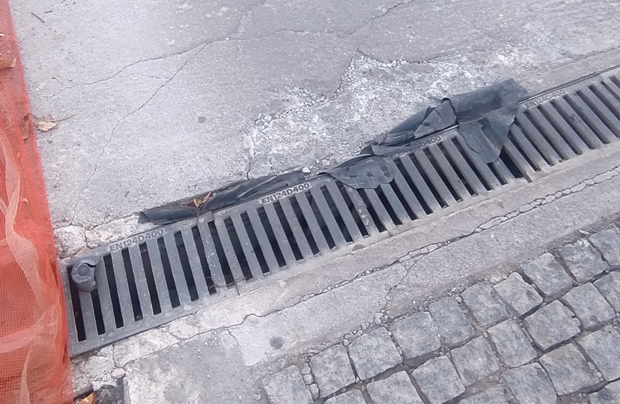 Οι σιδερένιες σχάρες που τοποθετήθηκαν πάνω από τα αυλάκια απορροής των νερών της βροχής έχουν αποσταθεροποιηθεί, έχουν βουλιάξει κι έχουν στραβώσει, με αποτέλεσμα σε κάθε πέρασμα αυτοκινήτου να ακούγεται ένας χαρακτηριστικός θόρυβος-χτύπος που θυμίζει Τραμ.