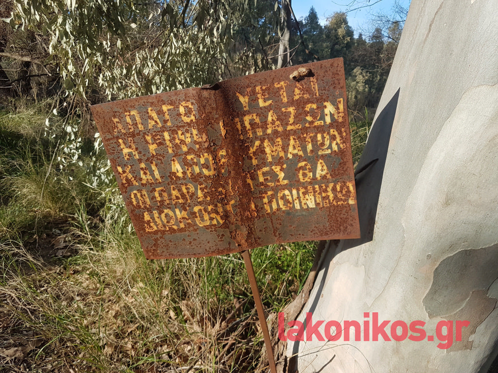 Ειρωνεία και ταυτόχρονα χαρακτηριστική αποτύπωση της θρασύτητας ορισμένων, αποτελεί μια σκουριασμένη από τον χρόνο επιγραφή, πλησίον των διασκορπισμένων αντικειμένων, η οποία αναγράφει: «Απαγορεύεται η ρίψη μπαζών και απορριμμάτων. Οι παραβάτες θα διώκονται ποινικά».