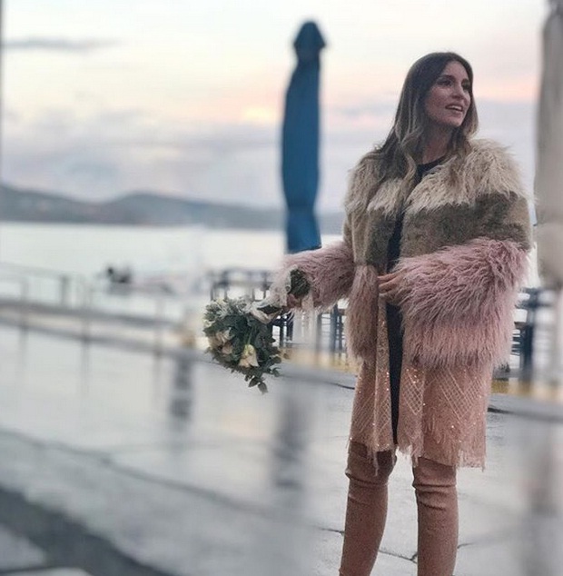 Η νύφη Αθηνά Οικονομάκου επέλεξε για το γάμο της να φορέσει ένα ροζ-μαύρο φόρεμα με οver the knee ροζ μπότες και γούνα σε ροζ και γήινες αποχρώσεις. Το φόρεμά της ήταν δημιουργία του ελληνικού brand Νidodileda και κοστίζει 195 ευρώ.