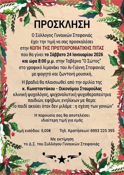 Την καθιερωμένη κοπή της πρωτοχρονιάτικης πίτας του διοργανώνει ο Σύλλογος Γυναικών Στεφανιάς, προσκαλώντας τα μέλη και τους φίλους του σε μια όμορφη βραδιά με κοινωνικό και εκπαιδευτικό χαρακτήρα.