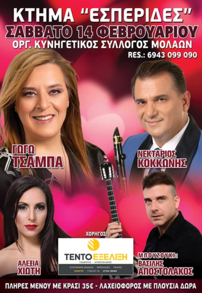 Ο Κυνηγετικός Σύλλογος Μολάων προσκαλεί όλους σε μια βραδιά γεμάτη μουσική, χορό και κέφι μέχρι πρωίας, στην καθιερωμένη ετήσια χοροεσπερίδα του, που θα διεξαχθεί στο Κτήμα «Εσπερίδες».