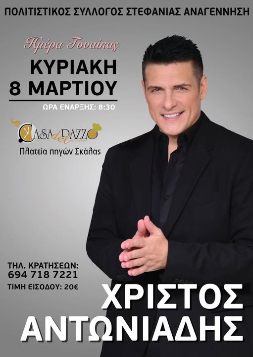 Μια ξεχωριστή μουσική βραδιά αφιερωμένη στην Παγκόσμια Ημέρα της Γυναίκας διοργανώνει ο Πολιτιστικός Σύλλογος Στεφανιάς «Αναγέννηση» την Κυριακή 8 Μαρτίου στη Σκάλα, προσκαλώντας το κοινό σε μια γιορτή γεμάτη τραγούδι, συγκίνηση και διασκέδαση με τη συμμετοχή του αγαπημένου καλλιτέχνη Χρήστος Αντωνιάδης.