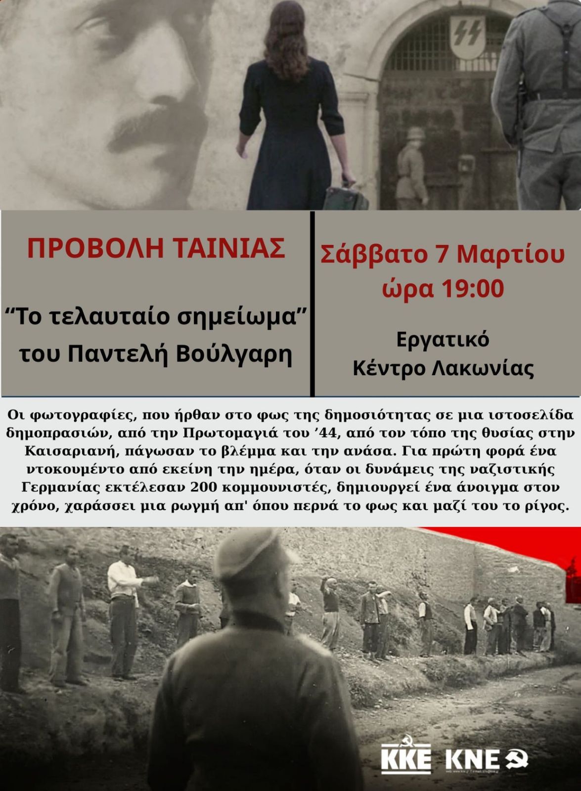 Με αφορμή τα συγκλονιστικά και μοναδικά ντοκουμέντα που πρόσφατα ήρθαν στο φως, φωτίζοντας το μεγαλείο ψυχής των 200 αλύγιστων κομμουνιστών που εκτελέστηκαν στην Καισαριανή την Πρωτομαγιά του 1944, η Τ.Ε. Λακωνίας του ΚΚΕ και το Τ.Σ. Λακωνίας της ΚΝΕ διοργανώνουν προβολή της ταινίας «Το τελευταίο σημείωμα».