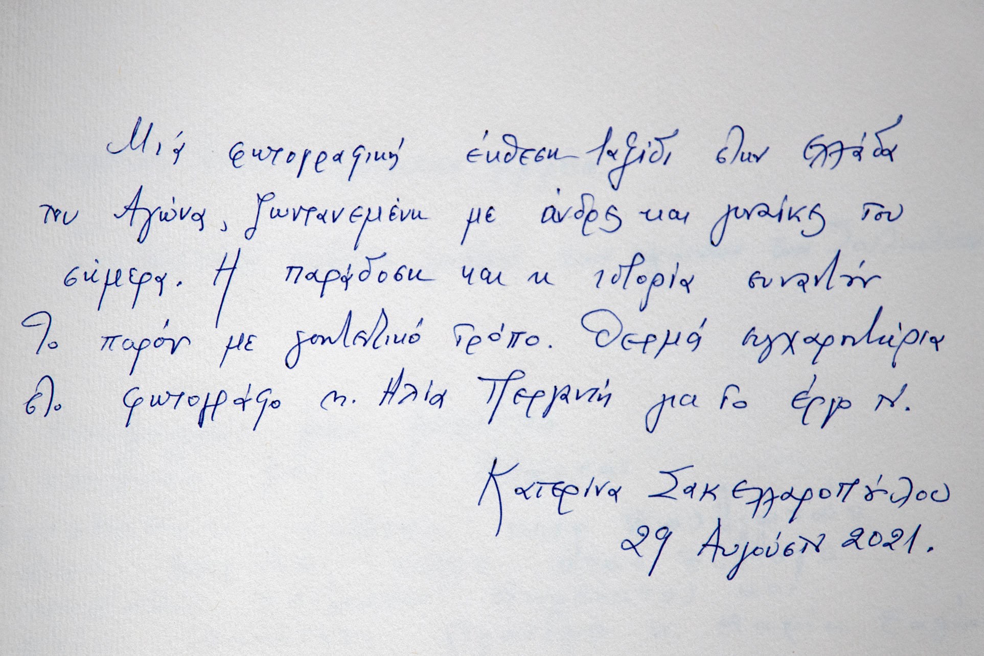 «Μια φωτογραφική έκθεση ταξίδι στην Ελλάδα του Αγώνα, ζωντανεμένη με άνδρες και γυναίκες του σήμερα. Η παράδοση και η ιστορία συναντά το παρόν με γοητευτικό τρόπο. Θερμά συγχαρητήρια στο φωτογράφο Ηλία Περγαντή για το έργο του.