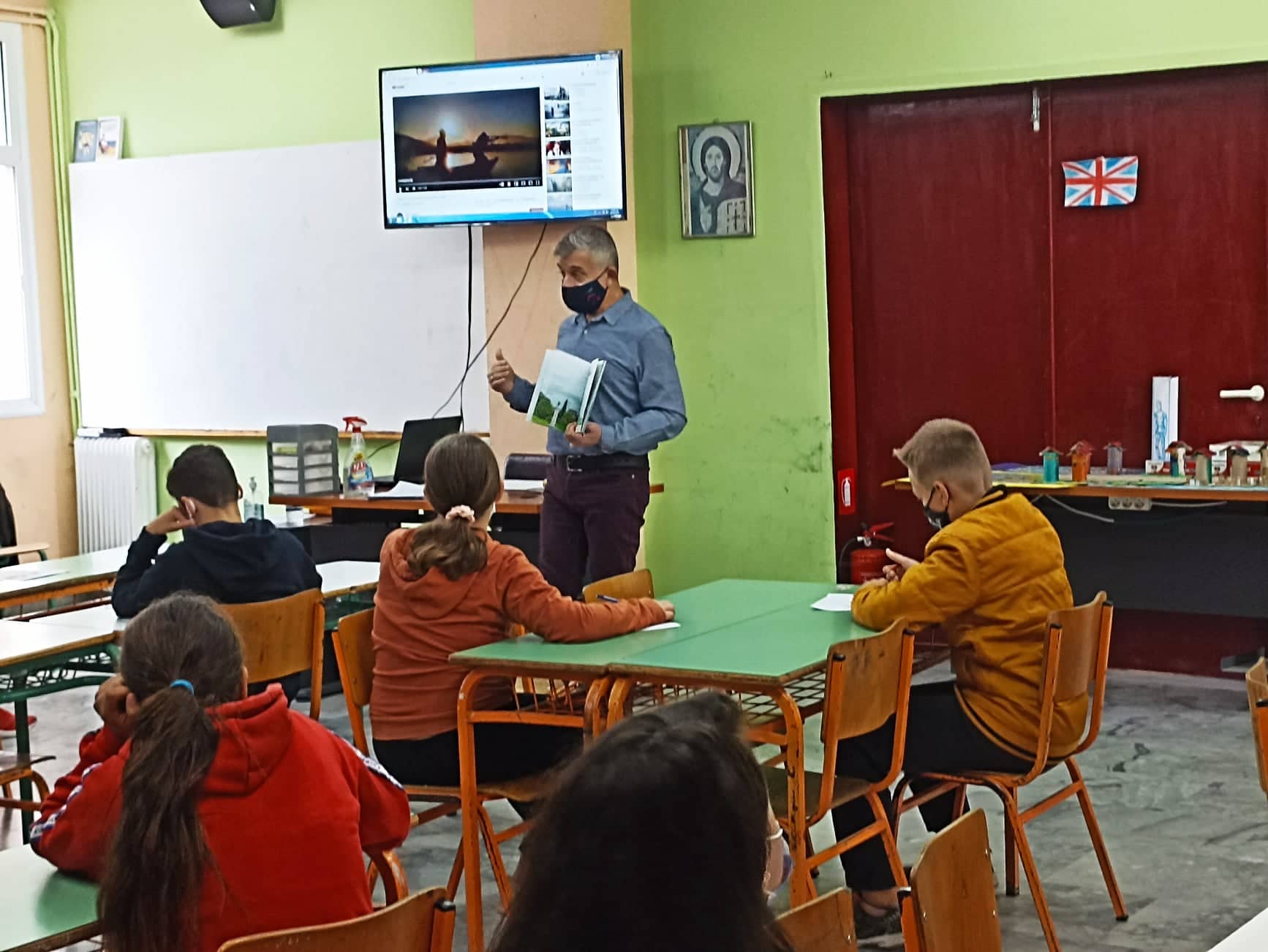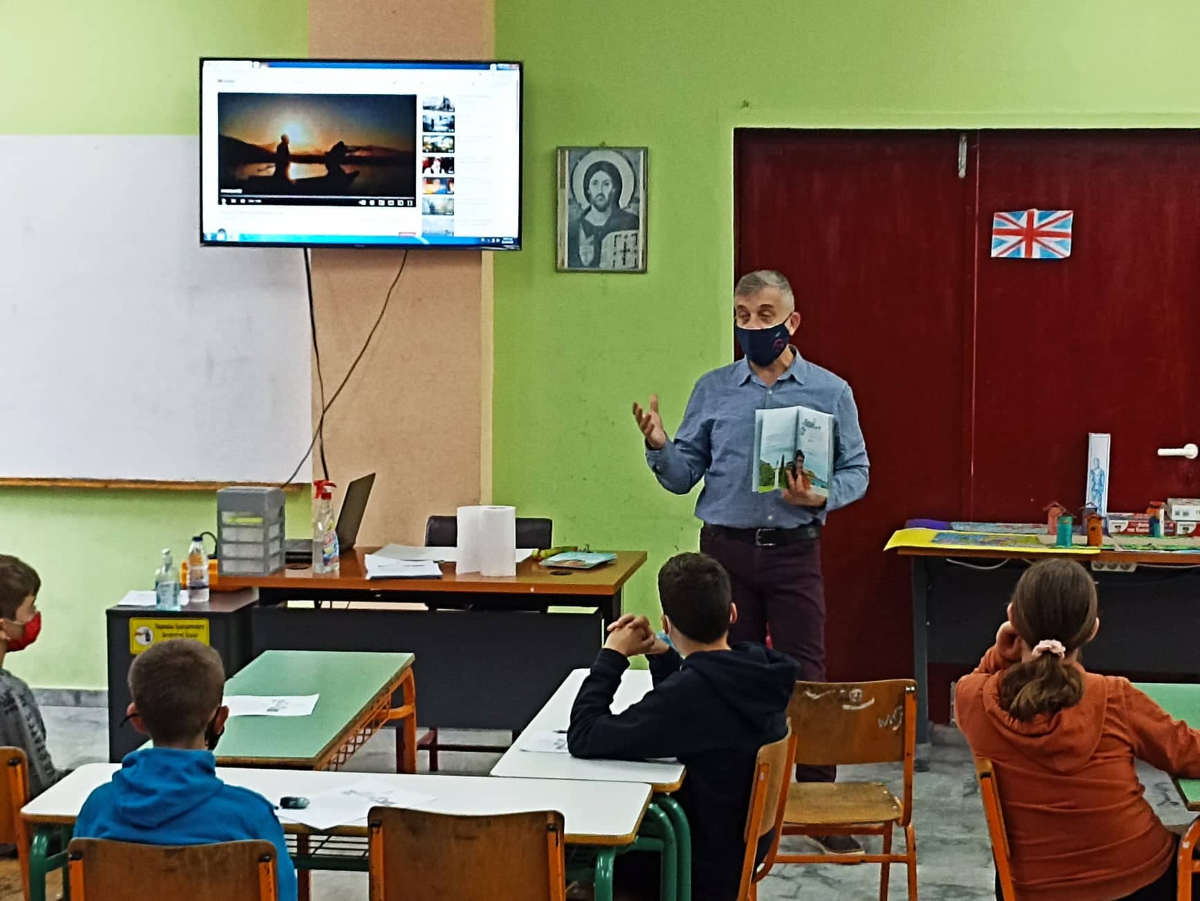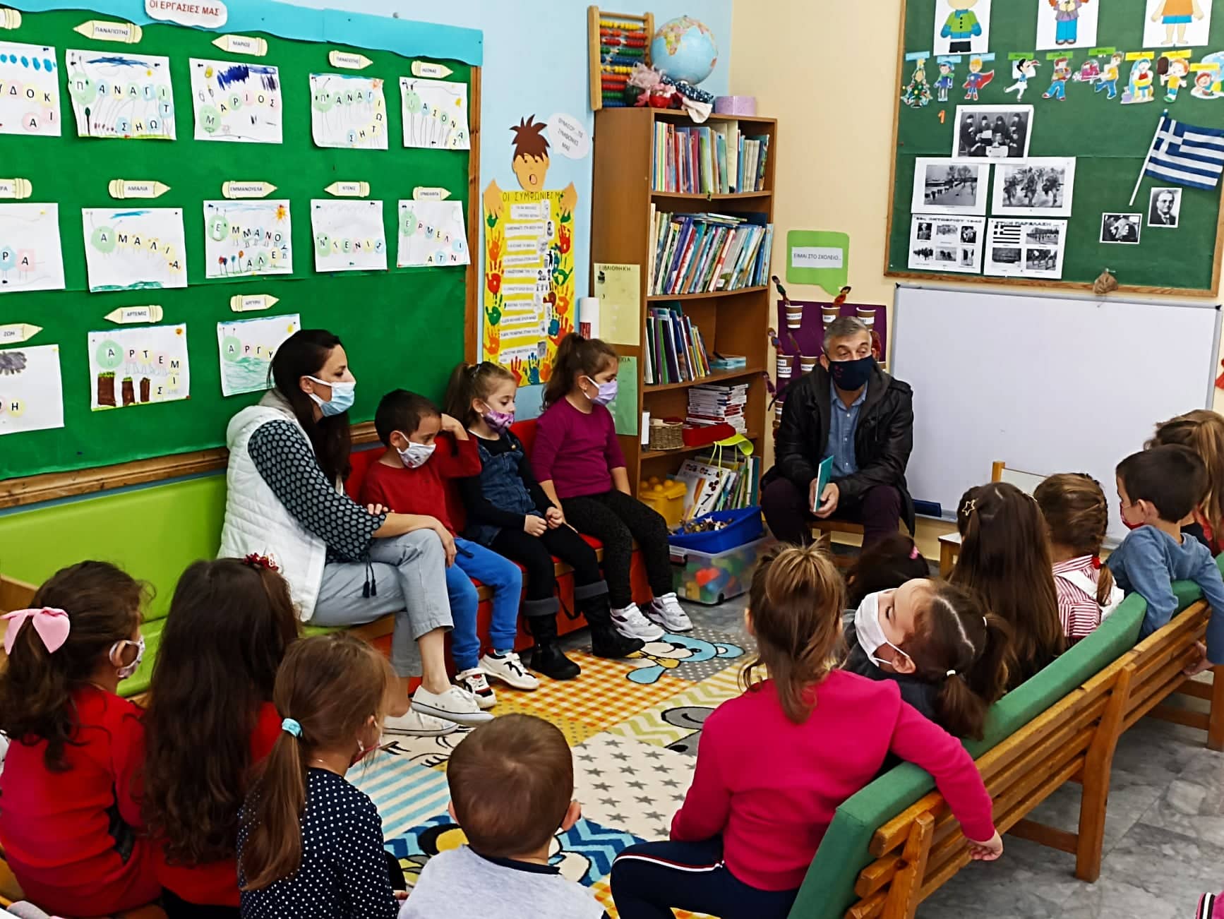 Στο Νηπιαγωγείο Ξηροκαμπίου μίλησε στους μικρούς μαθητές για την αξία της σχολικής αλλά και της οικογενειακής βιβλιοθήκης, ενώ στους μαθητές της Ε΄ και ΣΤ΄ τάξης παρουσίασε το βιβλίο του με τίτλο « Το παιδί με την φουστανέλα» που γράφτηκε με αφορμή την συμπλήρωση των 200 ετών από την Ελληνική Επανάσταση και αναφέρεται στη διαφορετικότητα και το ευαίσθητο θέμα των ανθρώπων με αναπηρίες.